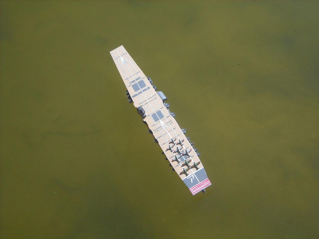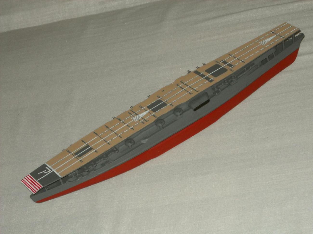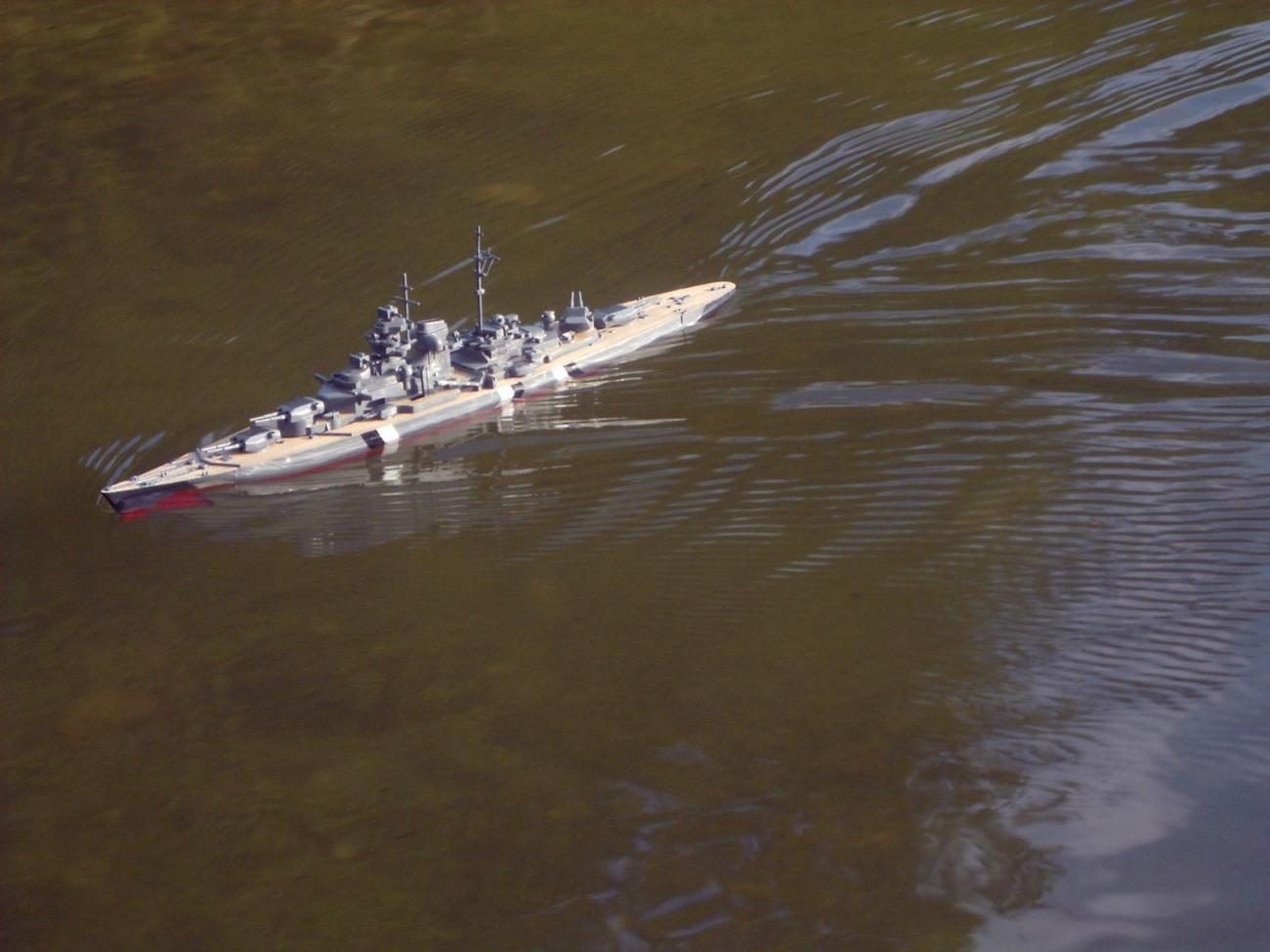 Hotový Bismarck se po spuštění na vodu v umyvadle a ve vaně choval uspokojivě. S Akagi jsem však zažil nečekaně velké komplikace. Trup byl ponořen příliš hluboko, takže loďka působila jako napůl potopená, a navíc se chovala labilně. Z kalkulací a testů vyplynulo, že nepomůže sebevětší odlehčení a jedinou šancí, jak dosáhnout, aby model působil na hladině přirozeně, bylo nějakým způsobem uměle zvýšit vztlak a stabilitu. S tou jsem se již předtím na jiném modelu potýkal a měl tedy po ruce řešení (balast na magnet pod trup). S prvně jmenovaným problémem jsem se však setkal poprvé. Nakonec jsem si poradil pomocí jednoduchého plováku z XPS přichyceného pod trup magnety. Směrem dolů z plováku vybíhá kýlová ploutev se zátěží z olůvka. Jelikož se trup při první zkušební plavbě stále nakláněl, byla posléze stabilita vylepšena prodloužením kýlové ploutve. Popsaný přípravek je možno přichytit i pod trup Bismarcka. Ten je sice stabilní dost a obejde se i bez něj, avšak jeho ponor je přeci jen o trochu vyšší, než by měl být. S pomocí plováku se čára ponoru dostane do správné pozice a model tím pádem při plavbě působí na pohled lépe.