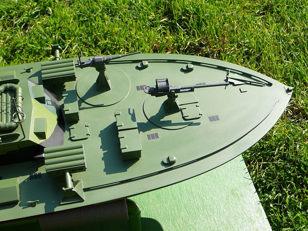 Vyřezání jednotlivých dílů jde celkem rychle, jedná se o palubu ze dvou k sobě slepených prkének balsy, kýl, dva outory a tři žebra. Při přesném řezání je kostra brzy připravená k sesazení nasucho. Tady nastaly první změny vůči plánu. Jeho autor použil k pohonu motor velikosti 500 – 600, převodovku 1:2,5, rychlostní šroub o průměru 40 mm a šestičlánek o velikosti AA. Převodovka, pouzdro hřídele šroubu a motor jsou uchyceny na dalším žebru, tentokrát překližkovém (asi 2 mm). Na nákup potřebného vybavení jsem se vypravil do prodejny Modelář Vaňouch, protože vím, že se zabývají rychlými čluny a jsou schopni poradit. Začal jsem vyjmenovávat, co všechno potřebuji a na otázku: “Do čeho to bude?“ jsem reagoval tím, že jsem vylovil z tašky plánek. “To má být rychlík?“ padla další otázka. “No, má to být dost rychlé a mělo by to vážit ke dvěma kilogramům,“ ochotně jsem potvrdil. “Tak to uděláme takhle: Dáme tam sedmistovku napřímo a desetičlánek. To by mohlo tu rychlostní čtyřicítku šroub utáhnout docela dobře. Větší šroub bych ale nedával. A v žádném případě převodovku. To je zbytečná komplikace.“ A bylo… Domů jsem si tak nesl část nákupu, desetičlánek jsem si měl vyzvednout o týden později.