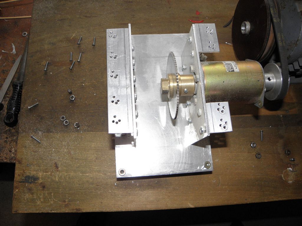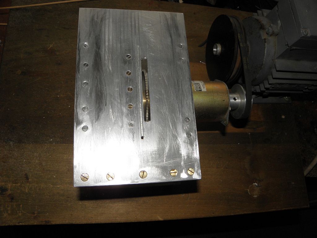 Vyrobil jsem si maličký stojan na pilku z duralových destiček a úhelníčků a celé to sešrouboval šroubky M4. Vodící lišta byla z duralového úhelníčku 20/20 mm silného 2 mm. Pilka o průměru 80 mm napasovaná na největší stejnosměrný motorek, co jsem sehnal, odmítala dělat drážky do prkénka, asi tvrdšího, než bylo v návodu, a tak jsem motorek použil jako hřídelku a na vyčnívající konec na druhé straně motorku jsem přidělal nejprve ozubenou řemeničku, a na velký motor 380 V asi 250 W jsem dal velkou řemenici na převod dorychla.