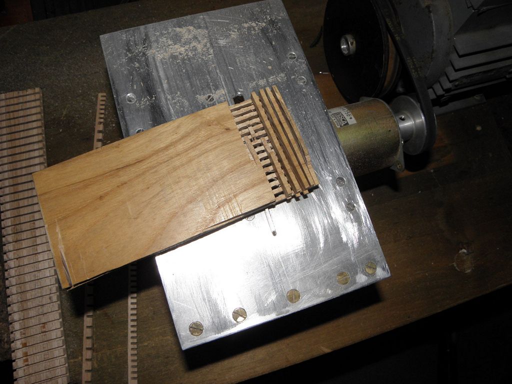 Ozubený řemínek po nadrážkování prkénka „po letech“ rychle vzal za své, když jsem se pokusil řezat prkénko napříč. Kromě toho se prkénko začalo štípat. Autor to asi myslel na balzu, a ne na to, co jsem chtěl já. Zkusil jsem měkčí dřevo, ale to bylo ještě horší, štípalo se to a zakusovalo. Koupil jsem tedy lišty z nějakého tvrdšího dřeva v železářství v Novém Boru (asi buk), aby se to neštípalo.
