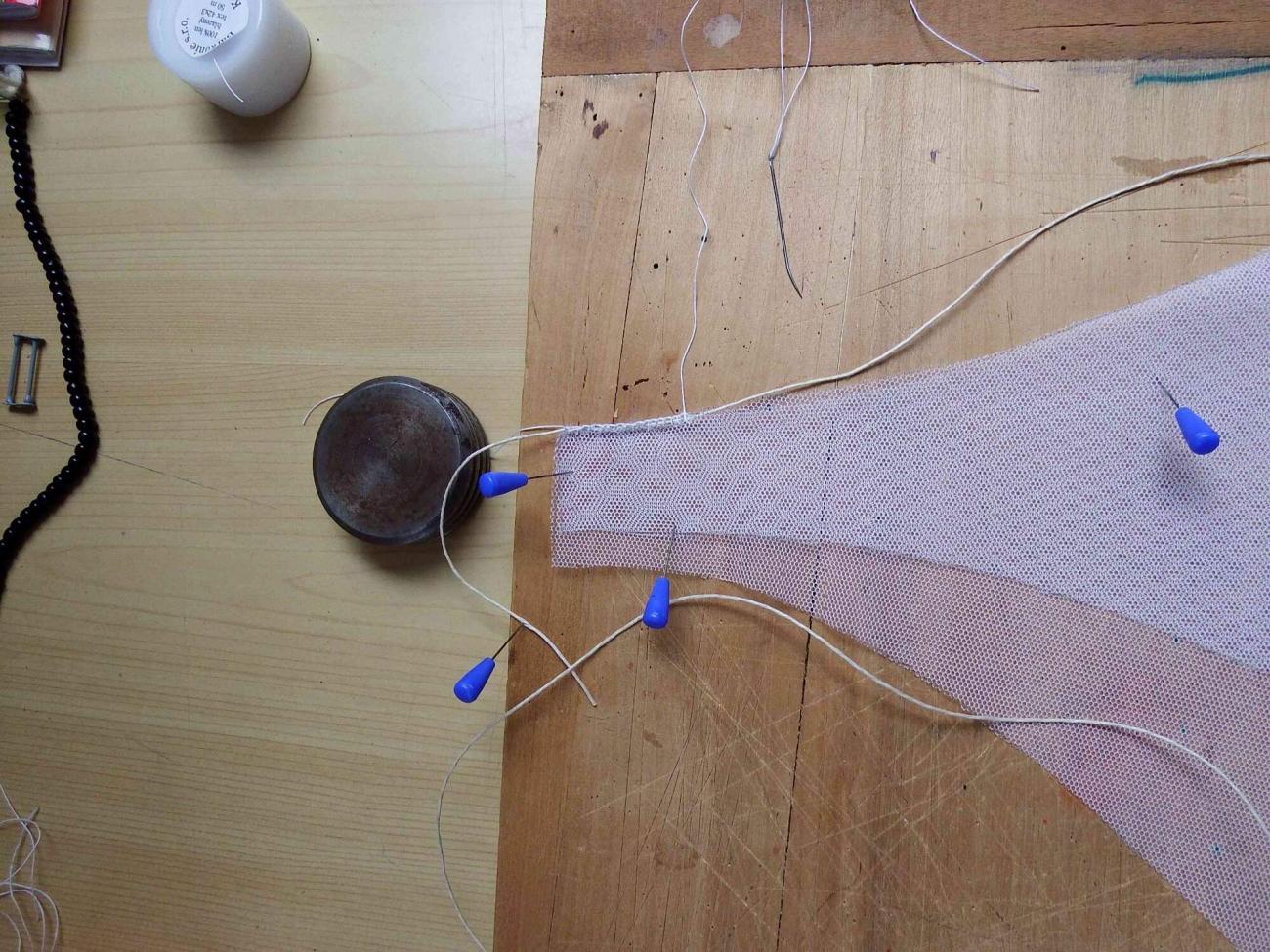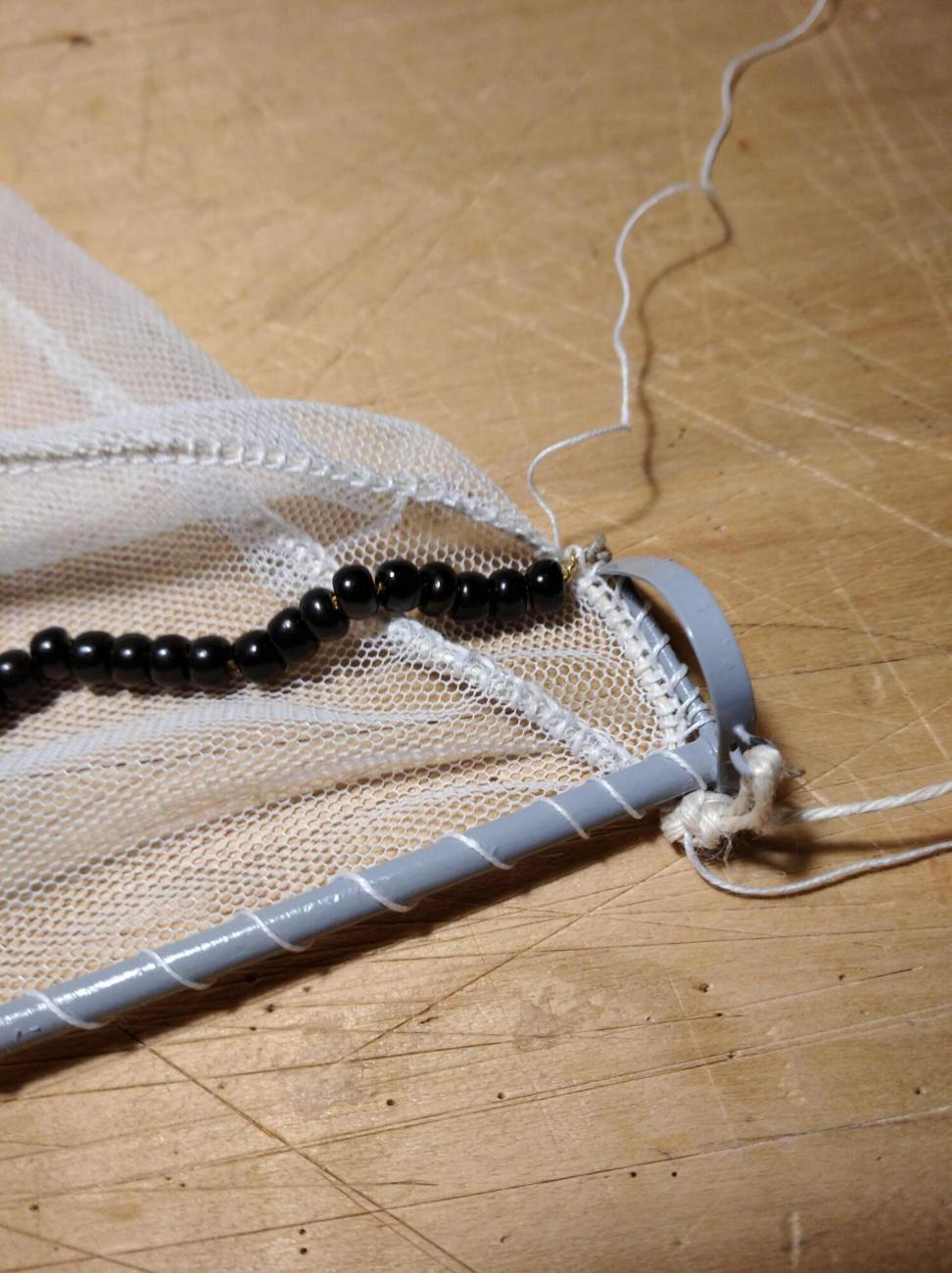 Z plánu jsem si zkopíroval šablony sítě na silnější karton a podle šablon z tylu vystříhal díly sítí. Na sešití jsem použil po obvodu sítě lněnou niť tloušťky 0,7 mm a vlastní šití je lněnou nití 0,3 mm. U role sítě (část jdoucí po dně moře) jsem nahradil dřevěné válečky ze stavebnice černými korálky z manželčiných zásob. Navlečeny jsou na řetízek ze stavebnice.