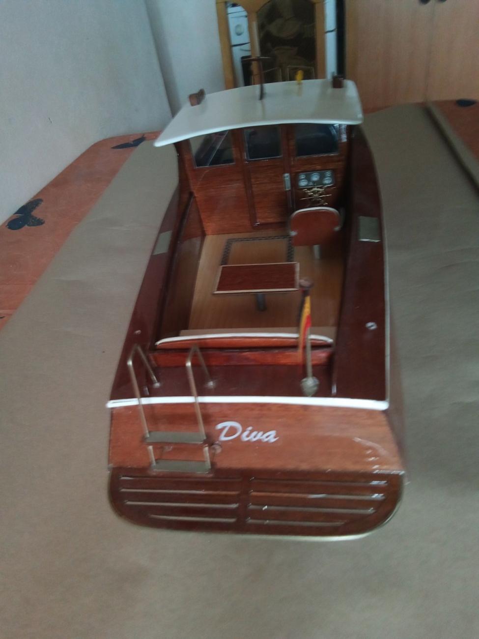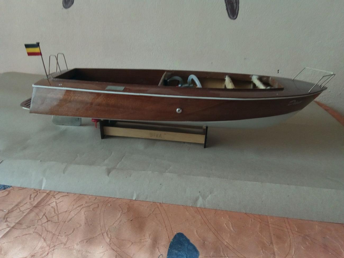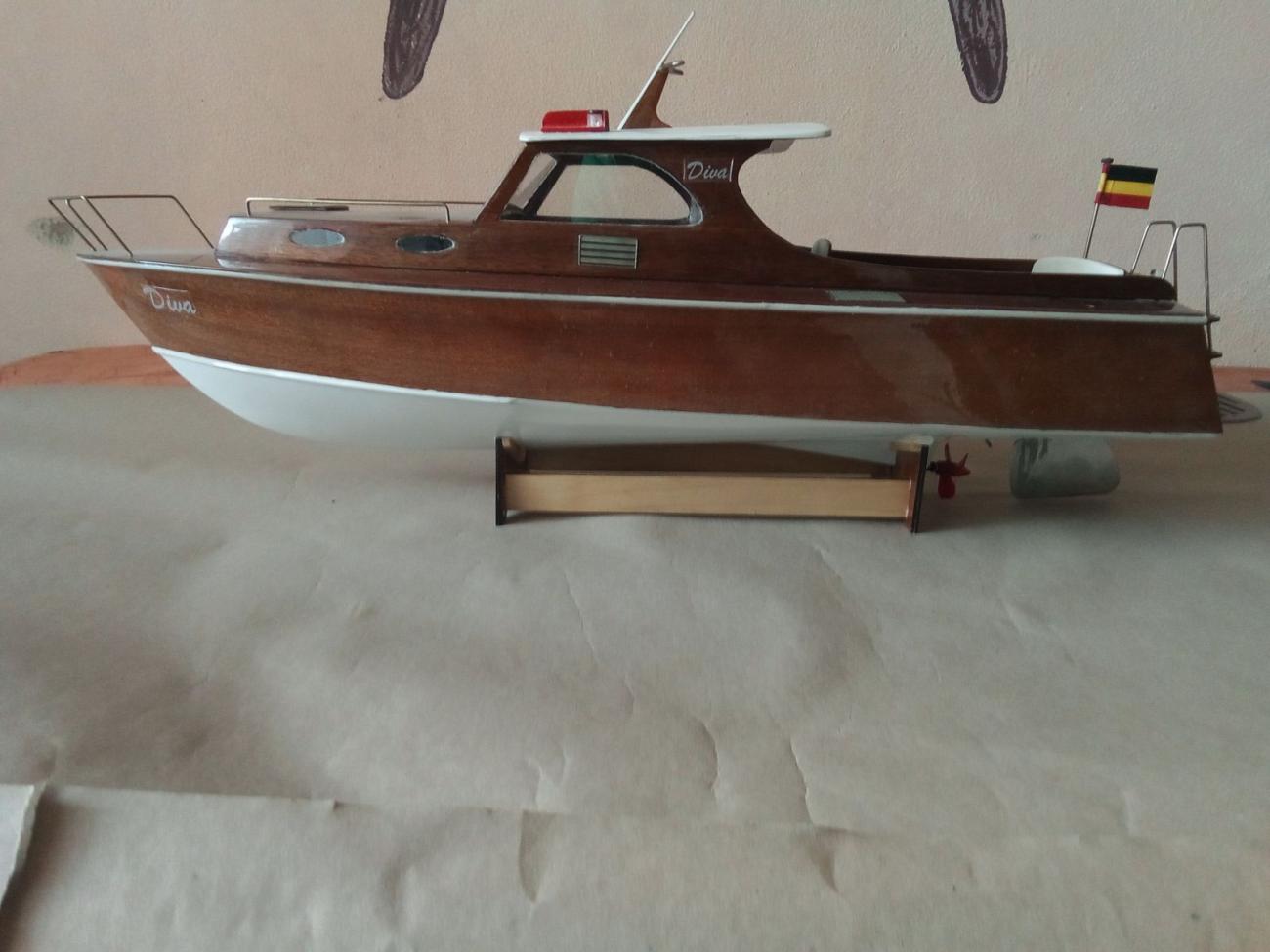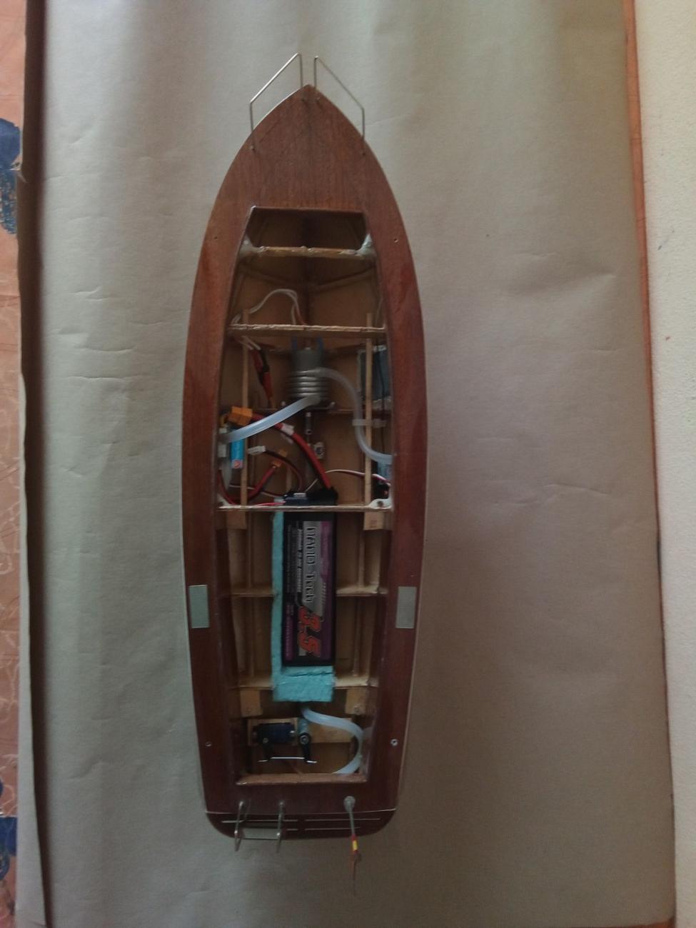 Motor stejnosměrný MIG 480 Li s chladící spirálou, regulátor stejnosměrný oboustranný New Rain 60 A, kormidelní digitální microservo Corona DS 939 MG (2,5 kg tah, kovové převody)a lodní šroub Graupner 3-list průměru 26 mm. Po rychlé hrubé stavbě následovala pro mě nejhorší etapa – laminování s tkaninou, vytření překližkového vnitřku trupu i kabiny epoxidem. A pak pořád dokola – trocha tmelení, moře broušení, barvení, lakování… Nakonec uplynul téměř celý rok, než jsem dílo dokončil. Skoro jako pověstné – do roka a do dne, hyn sa hukáže…![]()