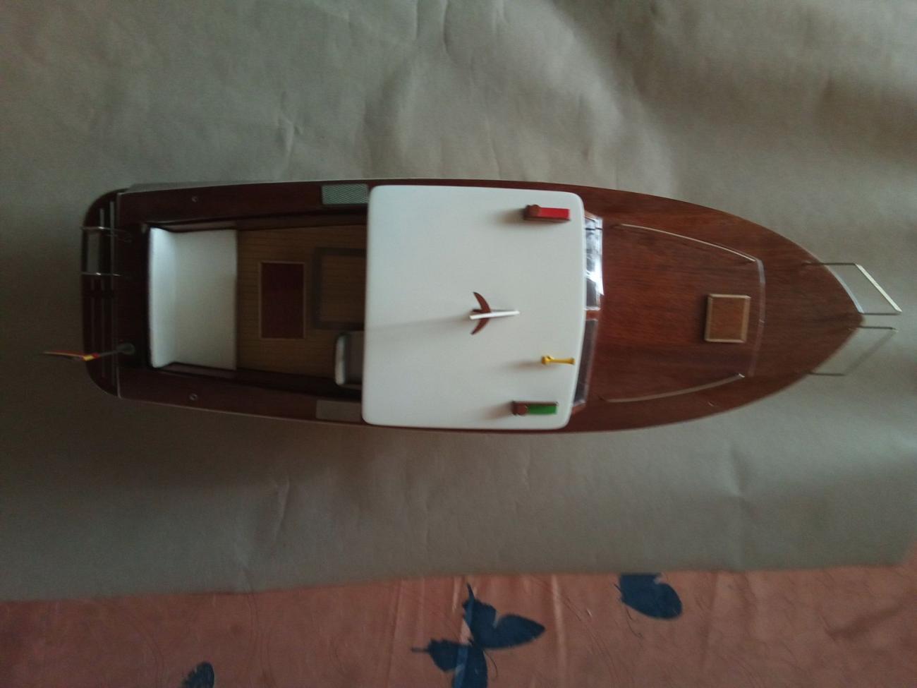 Jak bývá u stavebnic firmy Aeronaut zvykem, obsahovala přehledný barevný návod, perfektně zpracované překližkové i dýhové přířezy, zasklení oken, chráněné z obou stran fólií, dostatek skvěle provedené bižuterie včetně zábradlí, žebříku, schůdků a plata na zrcadle atd. Nechyběla ani bílá koženka na potah zadní sedačky a sedačky kormidelníka. Použil jsem i dodanou flexi spojku i lodní hřídel s pouzdrem, na který byla napájena redukce pro lodní šroub se závitem M4. Jen kormidlo ze stavebnice jsem nepoužil a vyrobil si o fous zvětšené z nerezového plechu. Hrubá stavba šla jako po másle. RC vybavení ve stavebnici samozřejmě chybí.