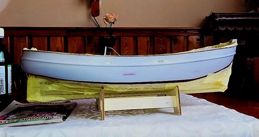 Paluba modelu je z jednoho kusu překližky. Je prakticky hotová, pouze na vnitřní část jsem musel vlepit výztuhy (viz plánek). Opět přebroušeno (velice jemně, jinak zmizí naznačená prkna paluby) a přelakováno z obou stran. Paluba má dva otvory pro uložení vnitřního vybavení lodi (regulátor, přijímač, baterie, případně další serva).