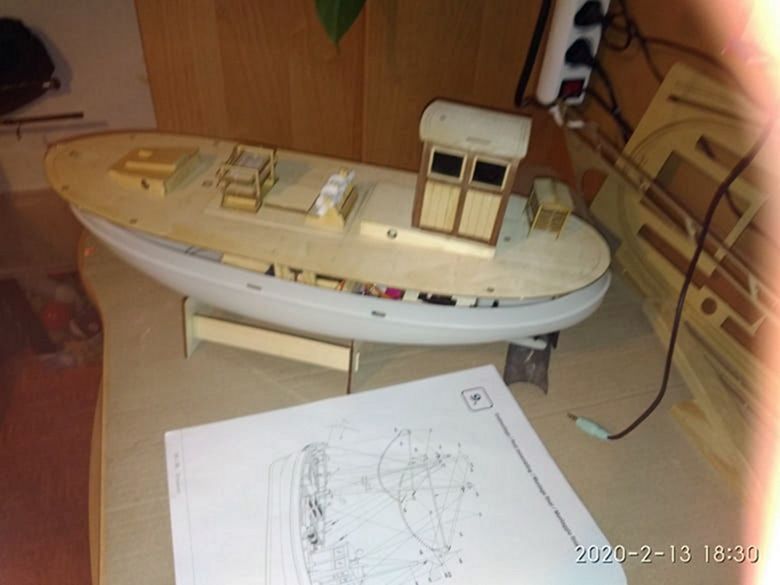 Jednotlivé nástavby (přední světlík, kajuta, naviják, síto) jsou slepeny dle obrázků. Kajuta je osvětlená LED diodami (poziční světla červená a zelená, přední reflektor).