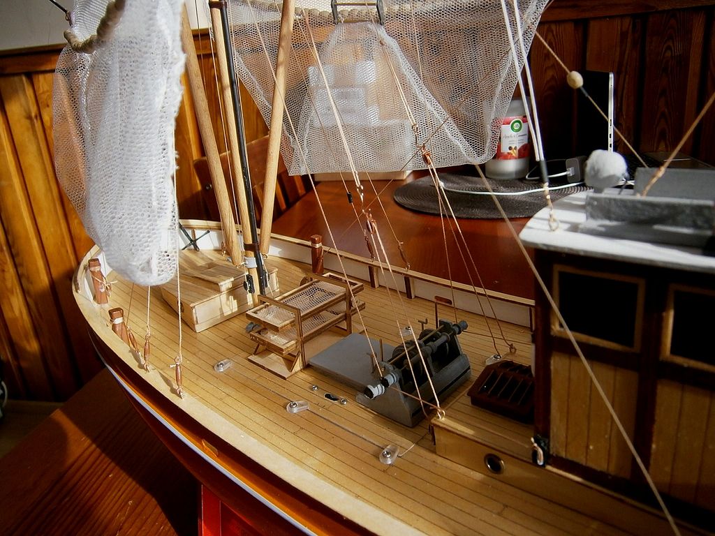 Po zaschnutí a vytvrdnutí barvy jsem palubu a trup spojil v jeden celek. Práce vyžaduje opatrnost a pečlivost, trup je v horní části měkký a paluba po nalakování trochu tvrdší. Při násilné manipulaci hrozí rozlomení paluby nebo prasknutí trupu. Postupoval jsem zpředu nasunutím výřezu a postupně jsem zasouval palubu do drážky v trupu. Pro správný tvar sítí jsem si před jejich vystřihnutím nakreslil papírovou šablonu. Ušité sítě jsem na několika místech zafixoval vteřinovým lepidlem. Nakonec jsem nalepil na zadní část paluby kamna, sušičku a kolem paluby 7 kusů úchytů. Stěžně a lana jsem dohotovil až na sestaveném modelu.