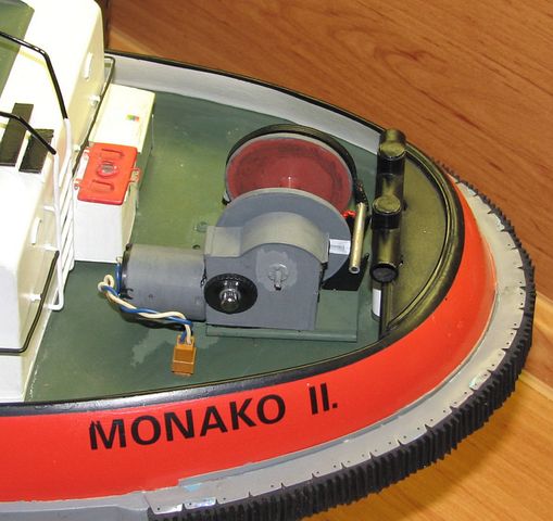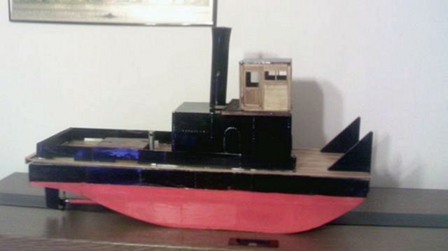 Po důkladné inspekcil všech zásob materiálu v loděnici, včetně toho, který měl být už dávno vyhozen, bylo nalezeno několik „klenotů“ a ty splynuly v jeden fukční celek. Plastová přepážka z kancelářskéhu šuplíku, plech a šroubky z PC case, motor, řemenička a převody z videa, k tomu nějaká ta výstražná tabulka a kousek depronu a to vše korunováno černou plastovou trubičkou, která byla u nových střevíců.