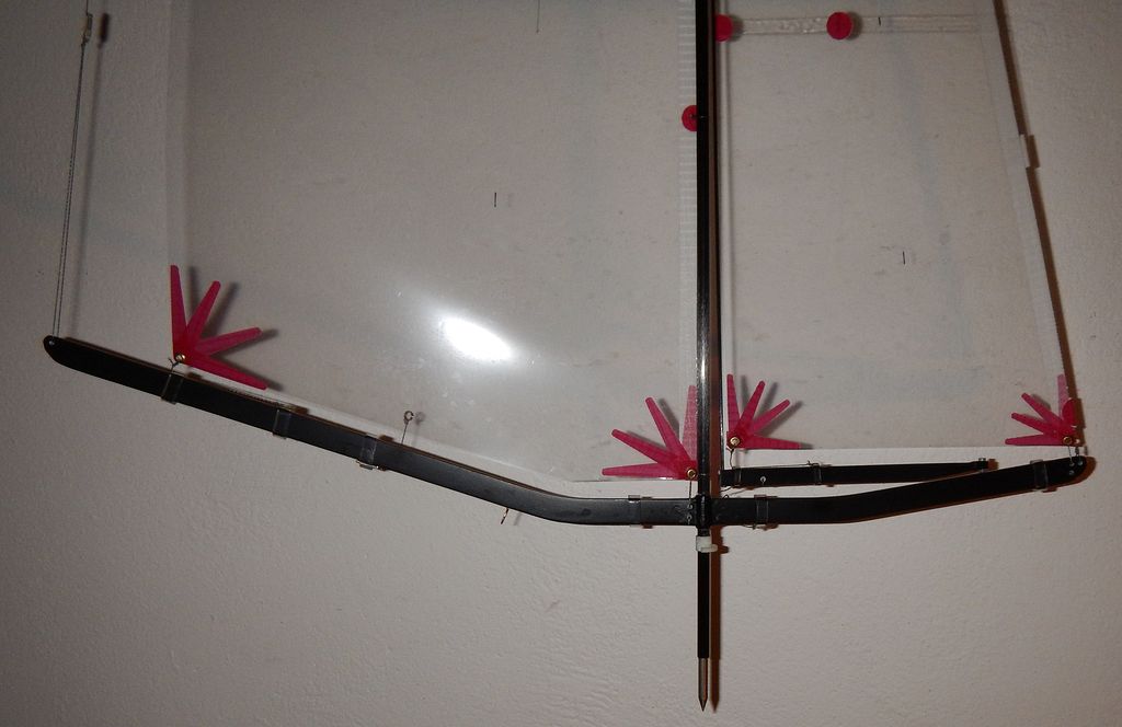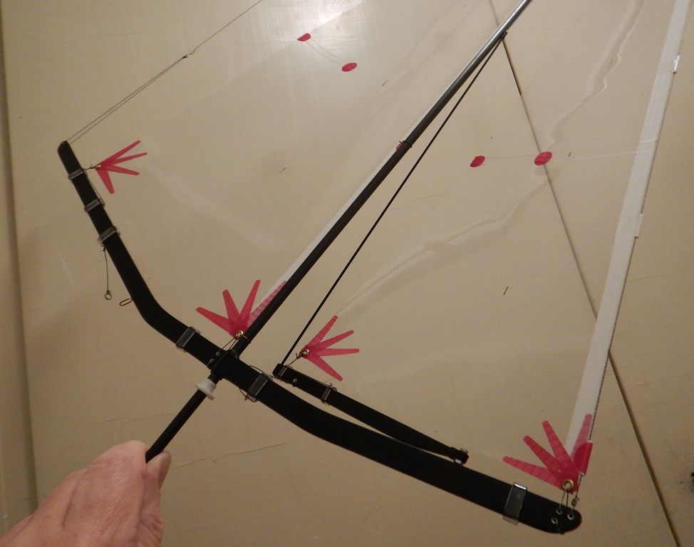 Vlastní stěžeň je složený z uhlíkové trubky 6/5 mm, nahoře je trubka 5/4 mm a výložník (crane) je vylaminovaný z uhlíkového provazce do zvoleného tvaru a vsazený do horní trubky. Crane můžeme vyrobit tak, že do hadičky zatáhneme uhlíkový provazec přehnutý na polovinu a prosycený pryskyřicí, hadičku v jednoduché „formě” tvarujeme do žádaného tvaru. Po vytvrzení hadičku podélně rozřízneme a máme tvarový kus. Trubky jsou v místě vsazení dalšího prvku zpevněny omotáním šňůrou Dyneema, prosycenou vteřinovým lepidlem.