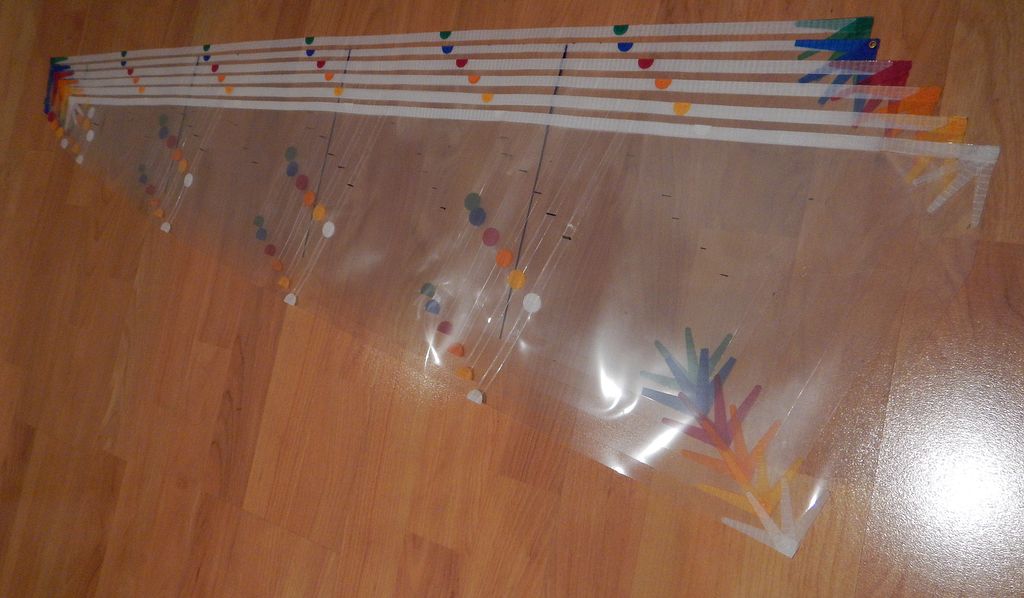 Další operací je nalepení výztuh zadního lemu (vzpíry), které pomáhají držet tvar profilu plachty. Používám různě silný průhledný plast například z obalů, tuhost je třeba vyzkoušet. Na připravený pásek nalepím oboustrannou lepicí pásku a umístím na plachtu. Po nalepení těchto výztuh je čas na další zpevnění plachty. Tady přijde ke slovu opět samolepící Skytex různých barev od výrobců padáků. Využívám možnosti vyříznout potřebné tvary na laseru, a to kolečka a protáhlé trojúhelníky. Na obou plachtách vyztužíme rohy plachty lepením trojúhelníčků střídavě z obou stran do růžice tak, aby se síla z úchytu roznesla do materiálu.