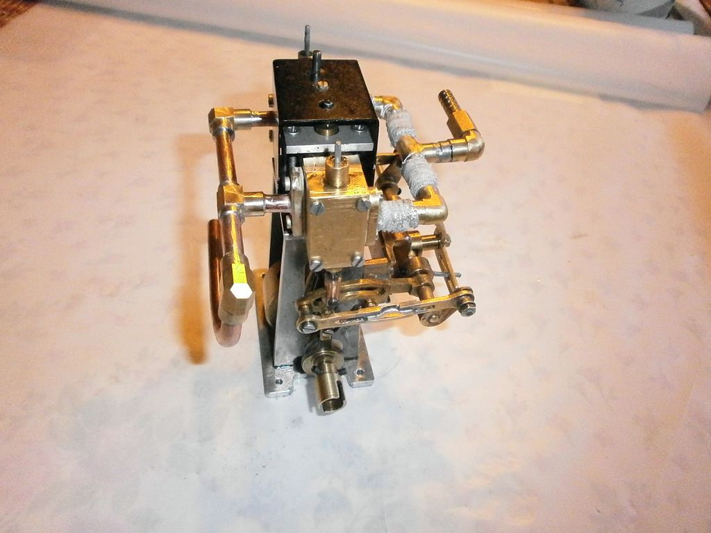 Excentry jsou tedy o těch asi 7 mm odsazeny od kliky vně, aby byly zhruba pod šoupátkovou komorou, trochu práce bylo s nastavením. Převod na přesun šoupátek podél jsem odkoukal od strojků Saito, kapota na válce, izolace trubiček na přívodní páru, ochlazovač a lapač kondenzátu a kotlík a je to… Není o čem prakticky psát, že?