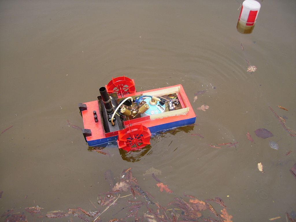), dále byly k vidění dva s turbínou a rovněž dva kolesové. Můj parní Springer absolvoval mimo soutěž svou první pokusnou plavbu po přestavbě na plyn a výměně parního stroje za americký. Jelikož se jedná o letitý nedodělek mých loděnic, do celkového počtu přítomných modelů jej nepočítám. Je na něm ještě práce jako na kostele, neboť původní nástavba z laminátových desek se v mezidobí napůl rozpadla a na nový palubní otvor stejně nepasuje - bombička se nevešla do podpalubí, a tak musela paluba pryč. Ivan Hořejší u své kolesové Olchy sice vezl bombičku na palubě, ovšem to je cesta, po které bych se vydával jen nerad.