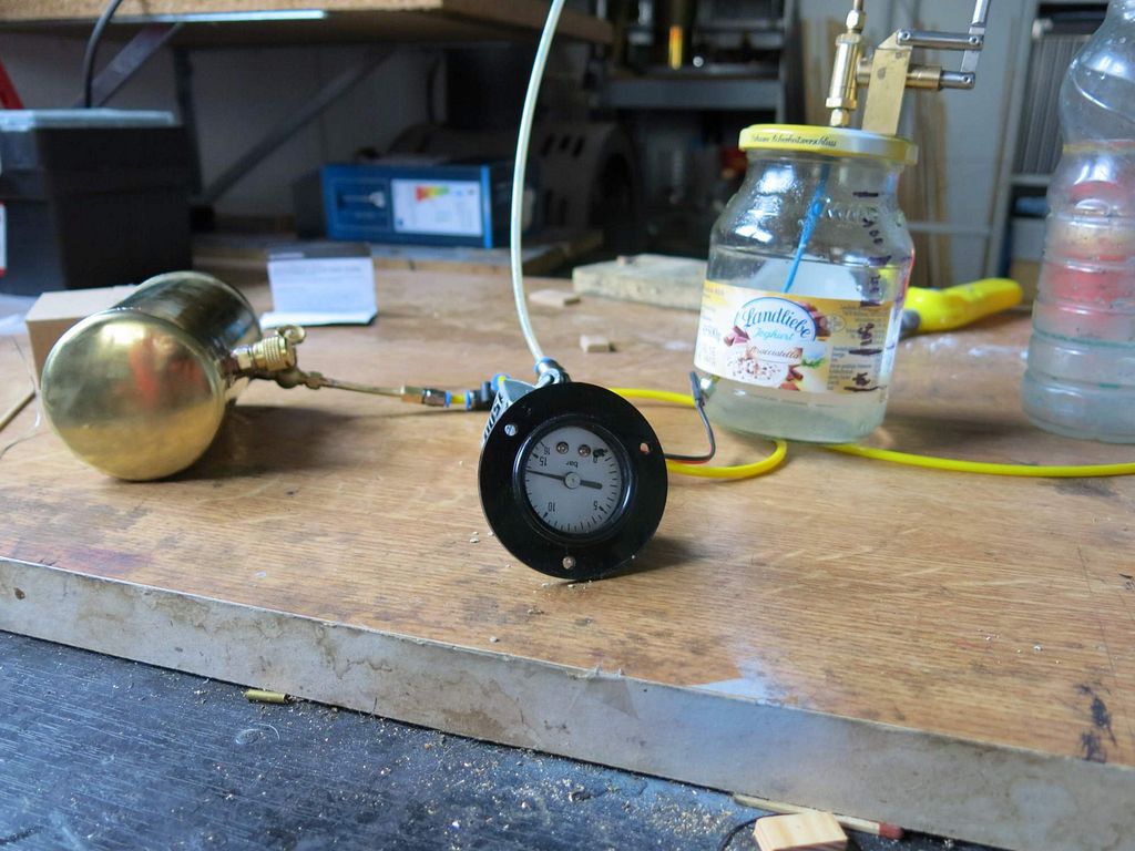 Na nádobe plynu je ďalší ventil, ktorý okrem uzatvárania plynu slúži aj na napľňanie plynojemu. Plynojem je osadený okrem uzatváracieho ventilu aj tzv. „odfukovým” ventilom, ktorý slúži na korektné naplnenie plynojemu. Pri plnení uzatváracim ventilom cez „odfukový” uniká plyn. Keď začne prúdiť v kvapalnej forme, zavriem prívod a aj „odfuk” a plynojem je správne naplnený. Plynojem, tak som nazval nádobu na plyn, som prirodzene podrobil predpísanej tlakovej skúške plynovej nádoby. Natlakoval som ju na 14 bar s tým, že pri skúške treba tlakovať dvojnásobkom prevádzkoveho tlaku. Nádobu s plynom (plynojem) som umiestnil nad kondenzátor kvôli ohrevu plynojemu (kondenzátor s plynojemom) z toho dôvodu, že pri úniku plynu z plynojemu prichádza k jeho ochladzovaniu a tým k poklesu tlaku plynu a tento jav naruší systém regulácie plynu a následne horenia.