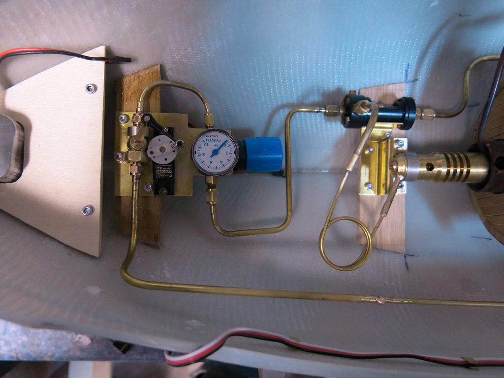 V prvom rade som sa začal venovať bezpečnosti plavby. V prípade, že ostane lodička v strede rybníka stáť, treba vypnúť plyn, aby neprehorel kotlík a nezhorela loď, ako Slaven. Tak som pod provu umiestnil uzatvárací ventil so servom. Plyn vstupuje do uzatváracieho ventila so servom, odtiaľ ide do regulačného ventila (udržuje rovnaký tlak na výstupe nezávisle od poklesu tlaku v plynojeme), z toho pokračuje do regulačného ventila, ktorý reguluje prietok plynu do horáka v závislosti od tlaku pary v kotli. Je nastavený tak, že pri tlaku 2 bar uškrtí plyn do horáka a pri poklese tlaku pary znovu otvorí plný prívod plynu.