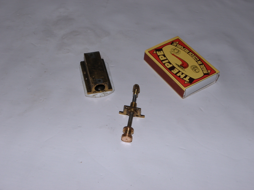 Neumím vyndat zalomený vrtáček z tvrdé mosazi a tak jsem vzal nový kousek měkké mosazi, označil si přepouštěcí otvůrky a vyvrtal je každý o chlup dále od osy než by měl být, takže celkem o asi 1 mm, což pomohlo. Mezi otvůrky je už ploška dlouhá skoro jako otvůrek, což znamená, že strojek může vykonat alespoň nějakou dráhu pod tlakem a tím tedy i práci... Uff.