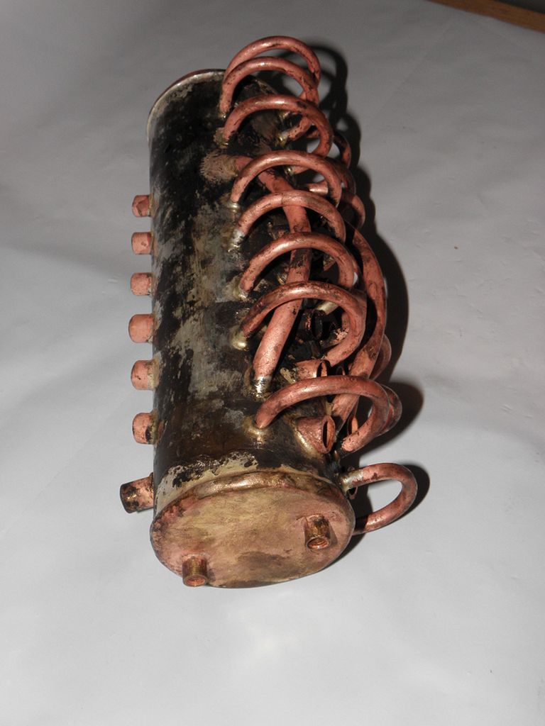 Jednoduchý kotlík, co měl pohánět rychlou loď, dával málo páry, a tak jsem ho vylepšil, a přitom nafotil. Celý kotlík je z mosazné trubky, jejíž průměr je asi 60 mm. Snadno se dá spočítat 12 trubiček o průměru 10 mm, které prochází šikmo válcem. Šikmo proto, aby se zvětšila plocha, která je vyhřívána spalinami. Původně byl kotlík na líh a knoty, přičemž samozřejmě plameny olizovaly i válec zvenčí.