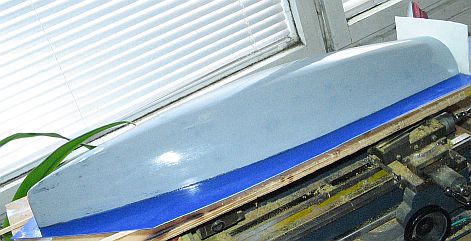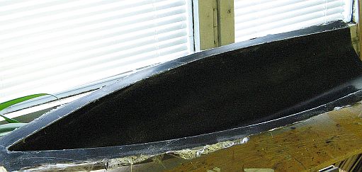 Podle planu vyřiznu žebra a neodlechčena upevnim hranolkama na pracovni desku, tak jak by se dělala obšivky s lišt. Mezi žebra dam pěnovy polystyren, celek zasadruji sadrou Uniflott, pro sadrokartonove desky. . Celek osmirkuji, polepim 6 cm širokou izolepou a olaminuji 3-4 vrstvy skelne tkaniny laminovaci pryskyřici. Na druhy den sundam z kopyta. Sadru i pěnovy polystyren vyndam, žebra očistim, odlechčim a vlepim do do trupu, včetně podelniku pod palubou a je hotovo.