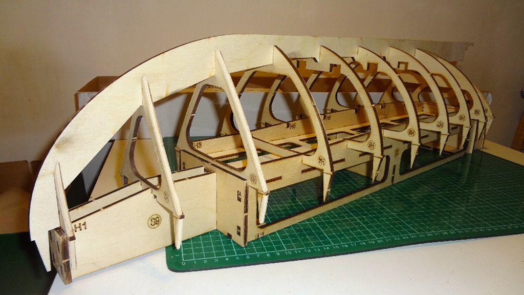 Stavbu začneme montážní pomůckou, kdy z překližky 5 mm sestavíme sestavu hranolů, do kterých později zasadíme žebra trupu.