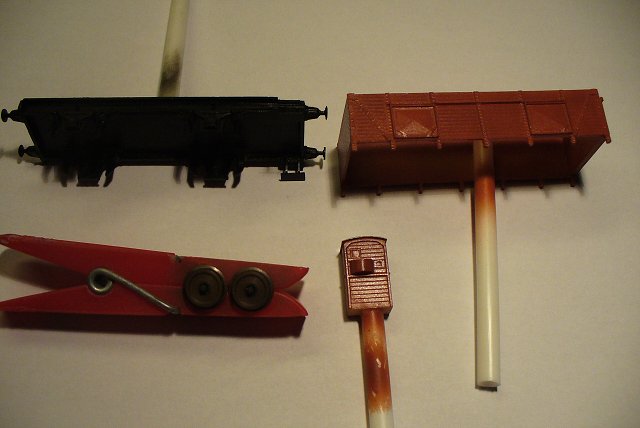 Díly po nástřiku, podvozek polomastnou černou, korba a brzdařská budka červenohnědou vagónovou a dvojkolí lehce rzí.
