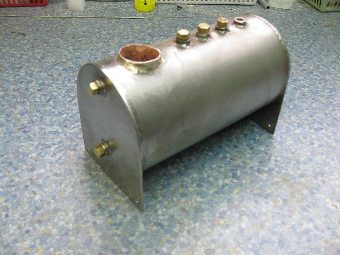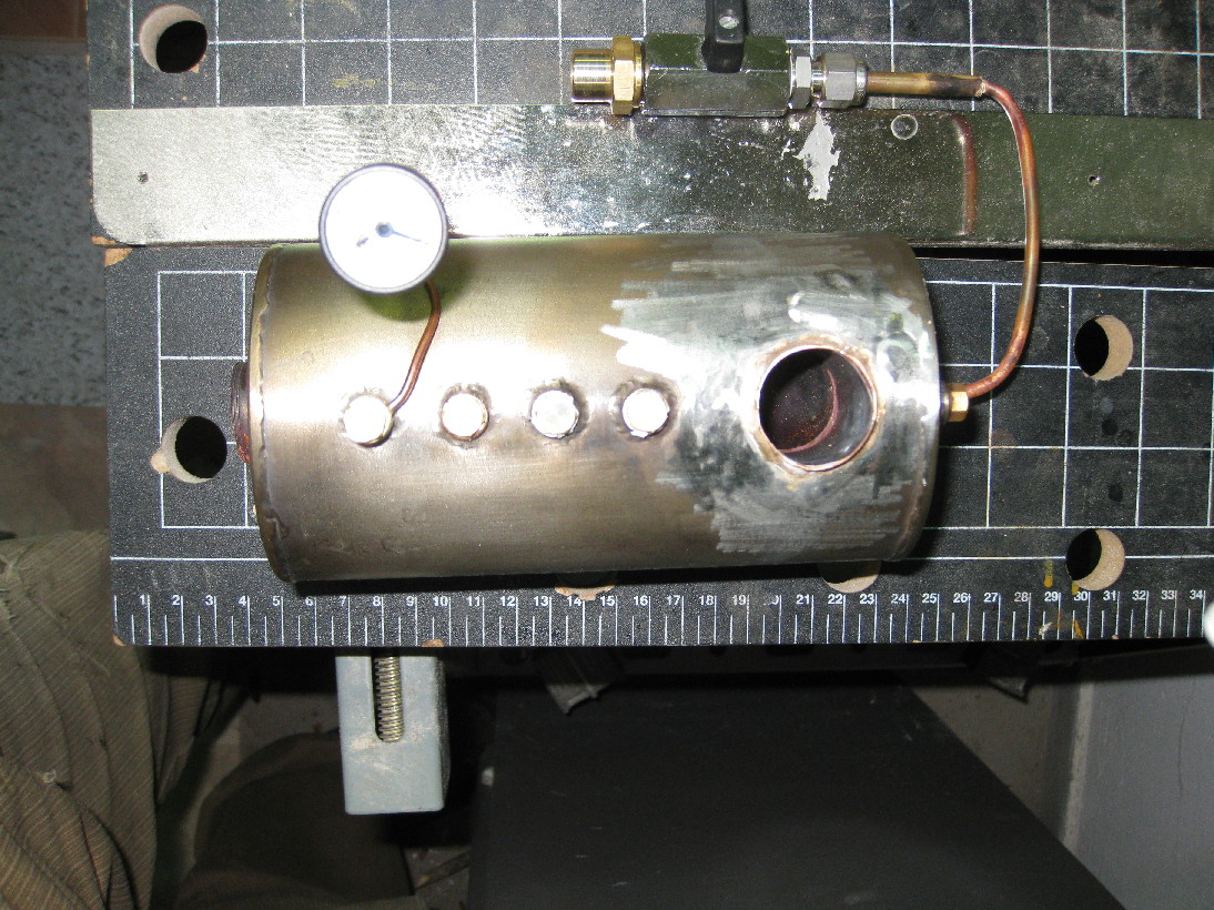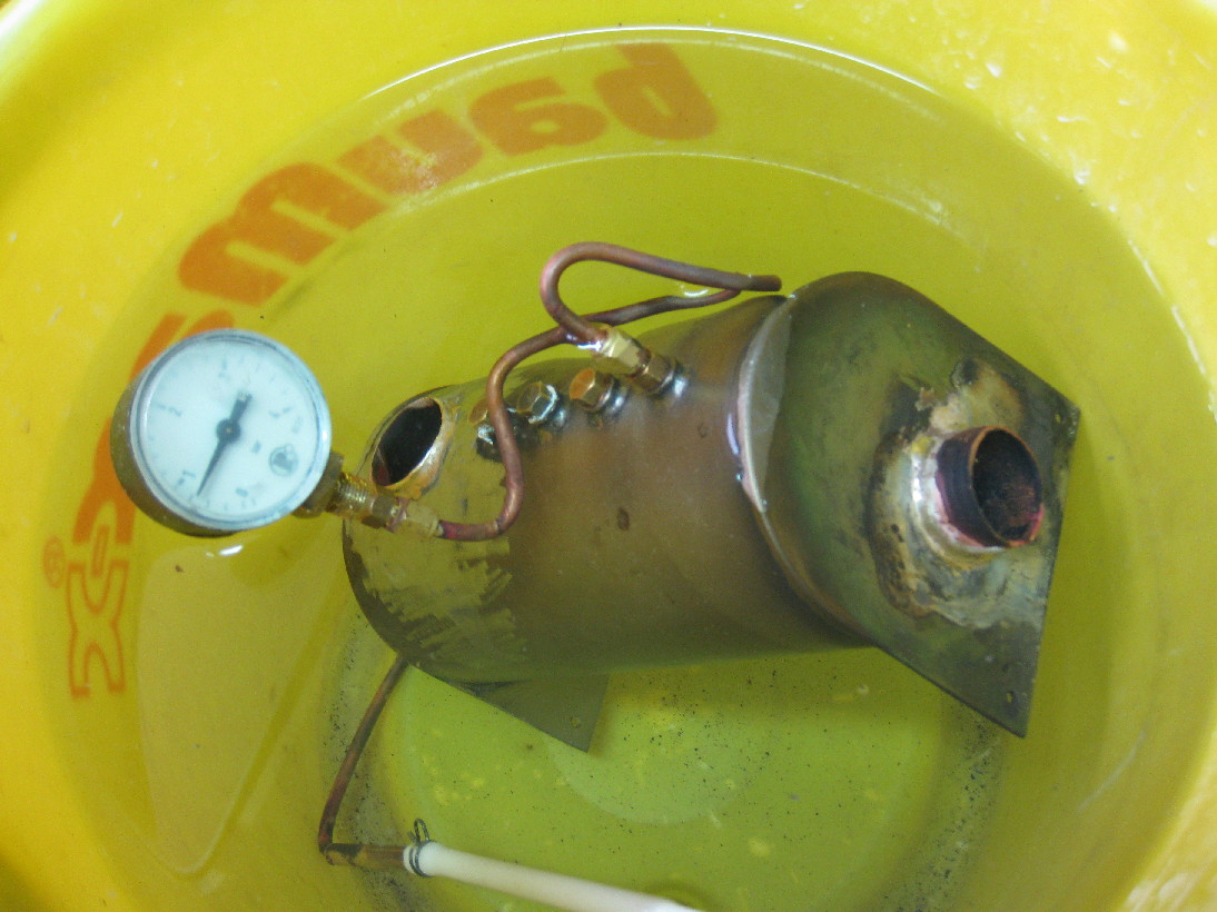 Po zletovaní všetkých spojov som plamencovú rúrku tlakoval a skúšal letované spoje na netesnosti. Kontrola bola na bublinky vo vode, ako i kontrola vodou pri 6 bar. Tým sa vyhnem prípadným problémom pri netesnostiach po zvarení plášťa kotla.