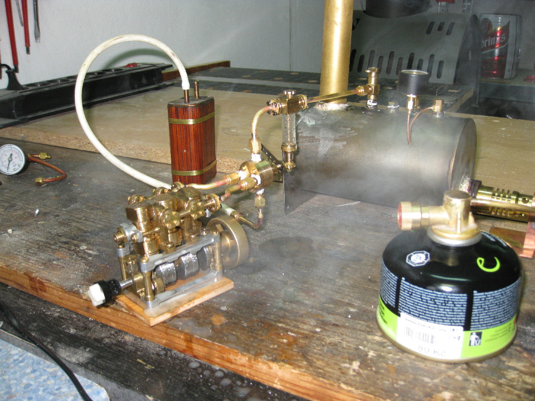 Trojválec od pána Pintéra pracoval 15 min pri tlaku pary 2 bar, kým neklesla voda na minimum. Vŕtanie každého válca 9 mm, zdvih 12 mm.