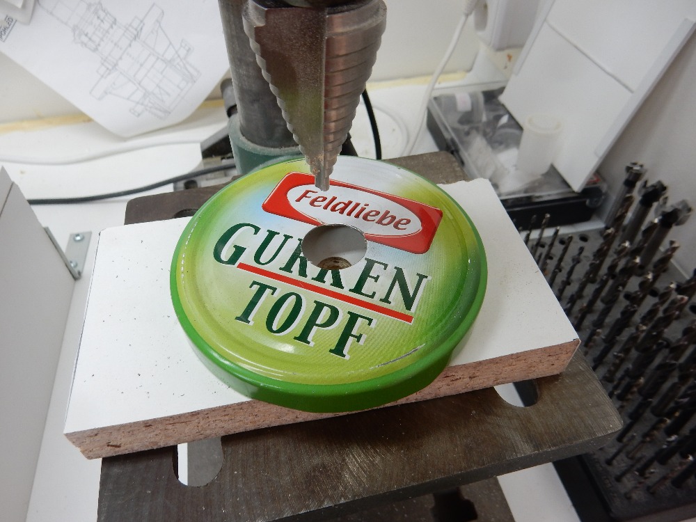 Nyní je nutno plechové víčko provrtat. Pomocí stupňového vrtáku je to sranda. Pro prodloužení ½”, volíme průměr 21 mm.