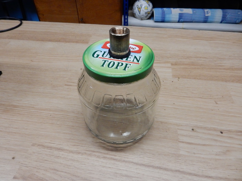 Vnitřek prodloužení je pro toto uzpůsoben. Utahujte prosím s citem. Gumová těsnění těsní dobře, guma by se mohla vytlačit bokem, navíc ve sklenici bude podtlak, který sám o sobě přitahuje prodloužení ke gumě směrem do sklenice. V tomto okamžiku jsme s podtlakovou nádobou hotovi.