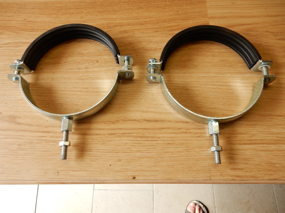 Každá taková objímka má určitý průměrový rozsah použití. Mnou zvolené mají rozsah 121 až 127 mm. I tak se může stát, že o malý kousek objímka nevyhovuje. Lze ji upravit vyndání jedné, nebo i dvou gum. Objímka je opatřena navařenou maticí M8. Stačí uříznout cca 5 cm závitové tyče 2 ks, matice, a objímky jsou hotové.