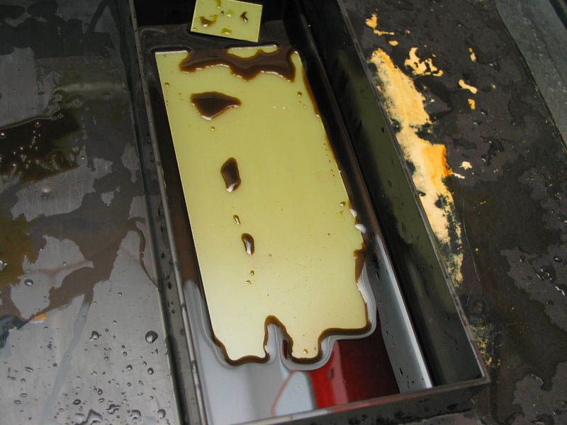 položíte na povrch roztoku měděnou stranou dolů tak, aby se měděná odleptaná část uvolňovala směrem ke dnu nádoby. Jinak dojde k nestejnoměrnému odleptání. Během procesu desku vyjměte a