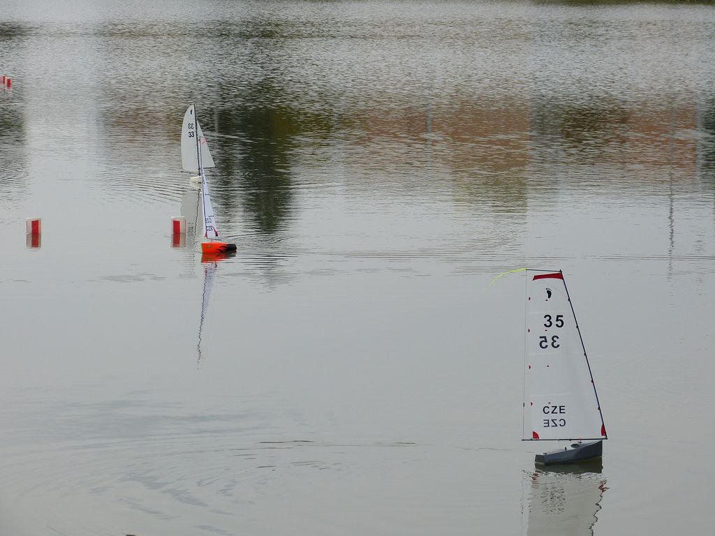 S plachetnicemi Footy jsme se z důvodu zdárného průběhu akce vydali na vodu o čtvrt hodiny dříve, než se plánovalo. Za hodinu a čtvrt se nám podařilo uskutečnit 10 jízd, přičemž maximální náraz na anemometru dosáhl 2,2 m/s a průměr se na 0,1 m/s vyhoupl až v poslední minutě. Dejv, kterýžto dorazil s přístavem a dalšími modely jako účastník srazu, si neodpustil několik poznámek na adresu našeho boje na vodě.