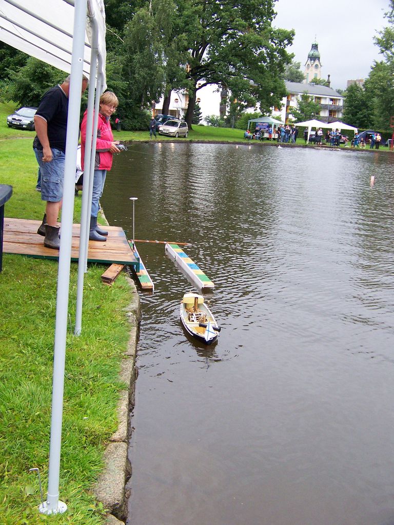 Na místo jsme přijeli kolem půl desáté, a byl to akorát čas, kdy na vodu šly parníky. Přiznám se, že jsem se těšil, protože parníky jsou moje srdcovka. Jaké však bylo moje zklamání, když jsem viděl, že na závodu se zúčastňují pouze tři modely. Útěchou mi bylo, že dva modely kormidlovali pan a paní Voráčkovi. Na jejich modely je pokaždé radost pohledět a musím uznat, že navzdory větru si vedly velmi dobře (tady si trošku šplhnu - paní Voráčková byla stejně lepší). Zatímco pára se předváděla na vodě, na břehu se začaly chystat bitevní lodě. Překvapivě byly také tři. Jestli se domluvili či co, mi není známo. Nutno říci, že tyto byly divácky vděčnější. Ne že by jejich jízdy byly natolik bravurní, či snad předváděly pyrotechnické efekty, to ne. Upoutaly spíše pobíhajícími kapitány po břehu, kteří se marně pokoušeli dostrkat radiové vlny anténou až k lodi. Holt spěch se nevyplácí a tady to platilo dvojnásob, stačí opomenout správně zapojit anténu, či ji nevytáhnout z vnitřku trupu a je na problém zaděláno. Ale i ony nakonec svou soutěž odjezdily.