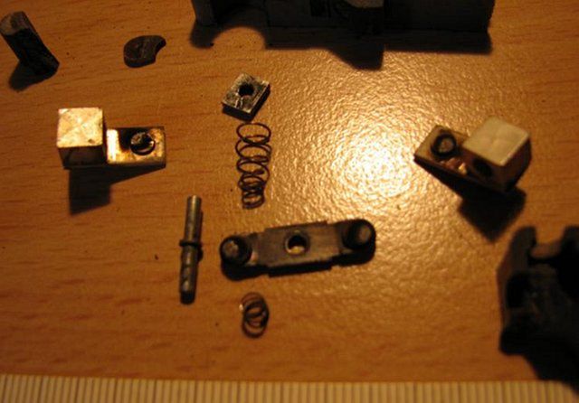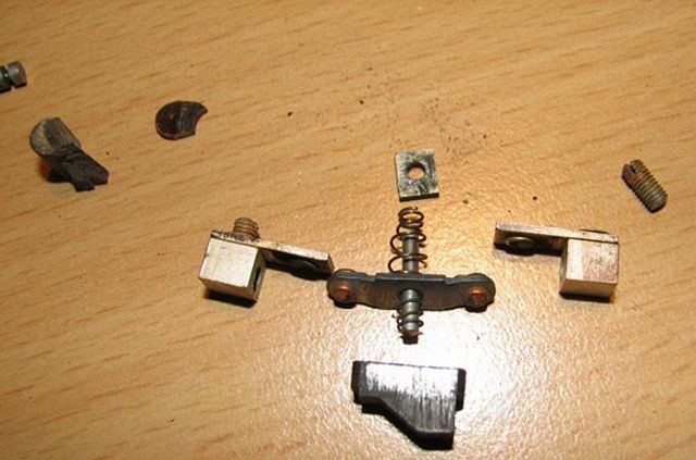 Pořadí dle obrázku 16. Kolík silnějším koncem do třmenu, na kolík pak ta menší pružina a to celé do tělesa s náběhem a nad třmen pak pružinu kuželovou a na konec kolíku ještě vodící kamének podle obr.17. Složení na obr. 15