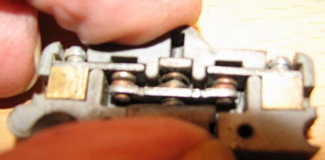 Taky skutečnost, že výstupní kostka pro utažení vodiče nesmí "lítat" proti tomu plechu, jinak nemůže sedat třmen na správnou plochu a uvnitř spínače je "zaklet" ještě jeden přechod způsobující i přehřívání vnitřku obr. 7