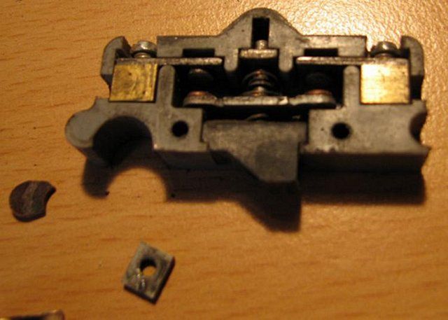 Načež po očistění dojde k objevu, že bakelit je odlomený V držadle je zachycen právě tou odlomenou částí obr.2