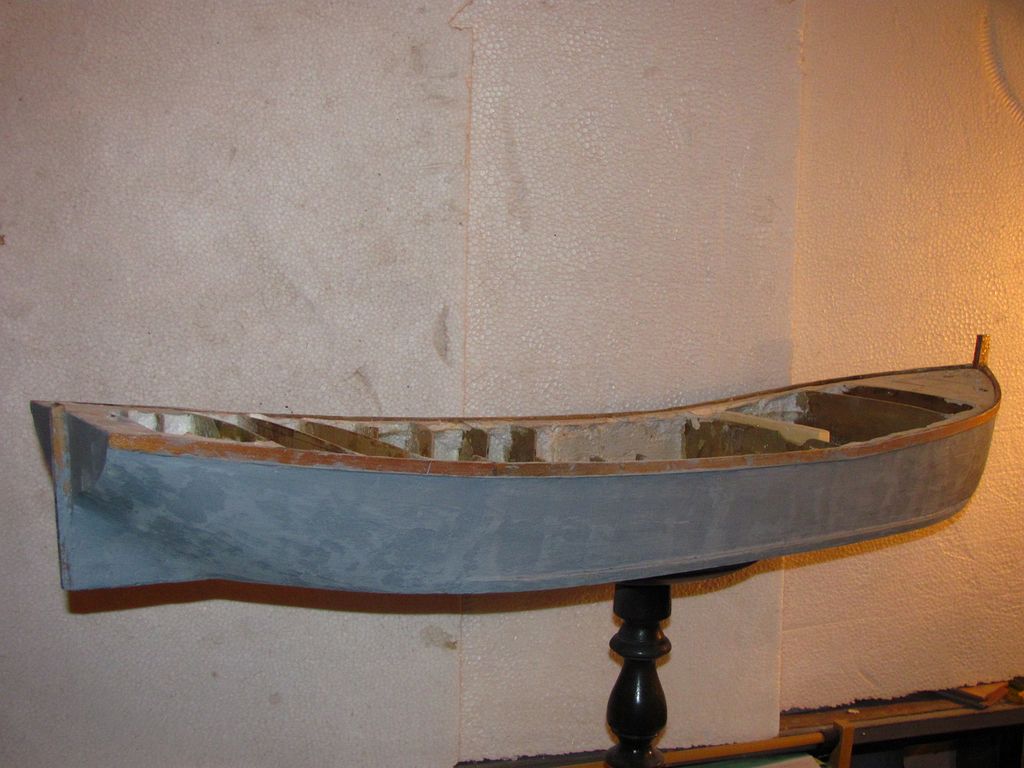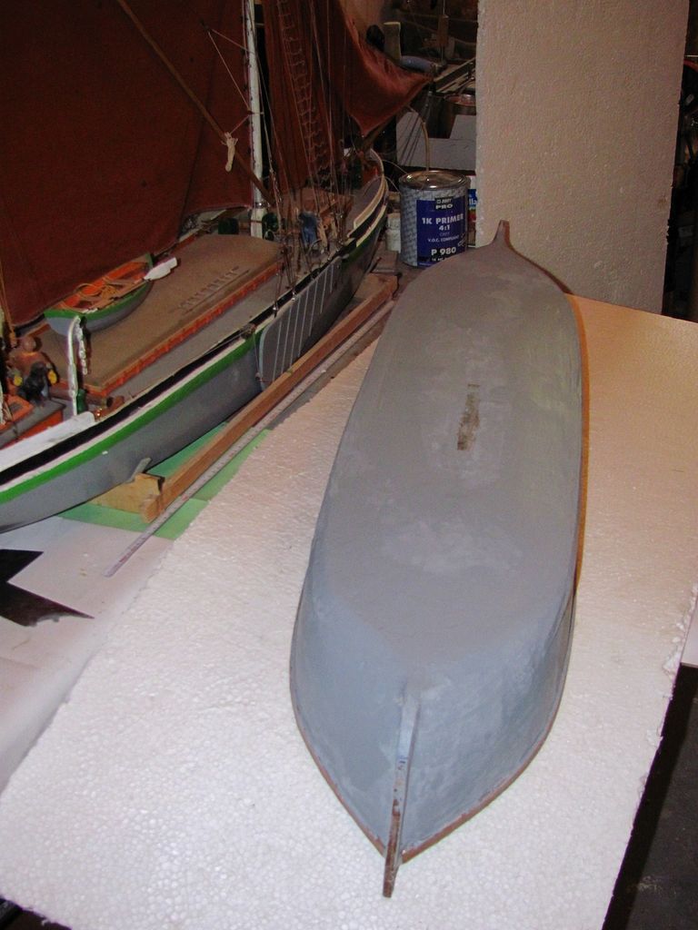 Před tmelením jsem ale ještě na trup nalepil epoxidem outorové lišty, a opasnici (sheerstrake). Obojí jsem následně přelaminoval tenkou skelnou páskou.