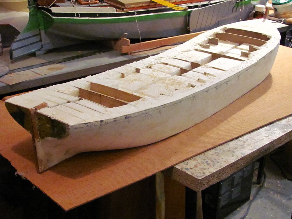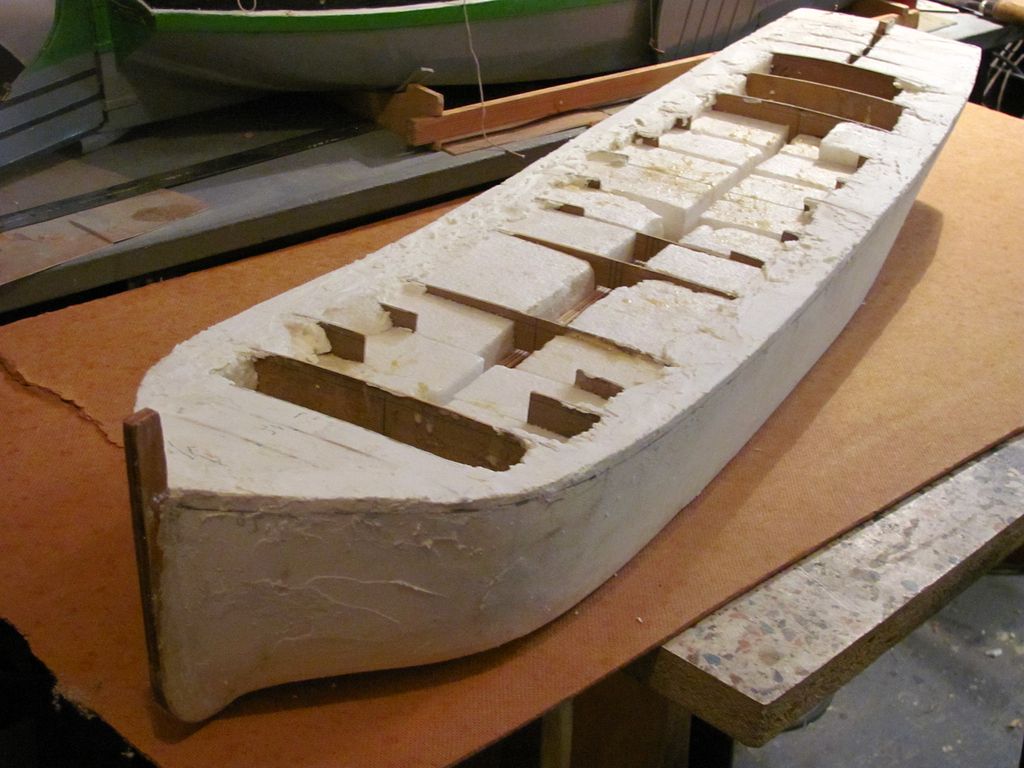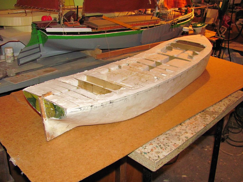 Chtěl jsem ušetřit váhu, a tak jsem už trup nezpevňoval podélně lepenými lištami na bocích a na palubě. Po zatuhnutí lepidla jsem z polystyrenu nařezal kvádříky, které jsem vlepil mezi žebra pomocí polyuretanového lepidla.. Následovalo obroušení přesahujícího materiálu pomocí rašple a velkorozměrového „brousítka”.