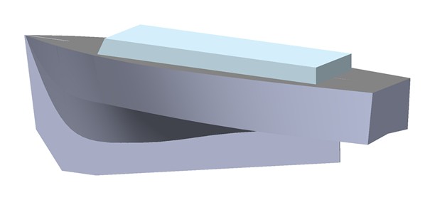 Od návrhu nové lodi jsem si sliboval zejména zlepšení stability při jízdě vpřed za silného větru a ve vlnách. Můj úspěšný model z roku 2024, má v pohledu zezadu trup tvaru „V“, a to v celé délce lodi. Ale vysledoval jsem, že při jízdě ve vlnách, má loď snahu se rozkývat ze strany na stranu. Proto jsem zkusil přepracovat záď lodi. Navrhl jsem vzadu plochý tvar, s mírným negativním úhlem směrem od kýlu (obrázek 03). Domníval jsem se, že to ploché dno na zádi stabilizuje loď při jízdě ve vlnách více, než trup tvaru V. Jenže jak se později ukázalo, změna tvaru zádi zlepšení nepřinesla. Naopak, nový design lodi přivodil více problémů na jiných místech. Což jsem zaznamenal během stavby samotné i během snahy o vylepšení jízdních vlastností později.