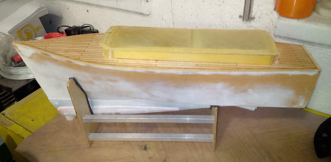 Boční obšívky jsem na žebra vytvaroval a nalepil velmi snadno, tam problém nebyl. Ale zato spodní pásy obšívky, přichycené a navazující na kýl, mi daly řádně zabrat. Podle 3D návrhu na počítači se profil spodku lodi postupně kroutí. Takže z tvaru písmene V na přídi mi přechází do plochého dna s mírně záporným úhlem na zádi. Takže jsem tu spodní obšívku musel postupně stočit jako vrtuli (obrázek 05). Následkem překroucení dvou spodních pásů mi na překližce vznikly mezi žebry značné vlnky. Namísto hladkého povrchu se objevily propady a kopce jak na eternitové střešní krytině (jasně, že přeháním...). Ve finále jsem to opravil tmelem, ale v množství více než malém. A také mě překvapila ta navýšená spotřeba smirkových papírů. Toho broušení do konečného hladkého tvaru bylo o poznání více, než jsem očekával. Škoda, že nejsem jako ZHZ a nemám tento druh opracování povrchu tak v oblibě. Na rozdíl od našeho kolegy „Footynáře“, proslulého specialisty na broušení všeho druhu. No nic. Hlavně, že se mi trup nakonec povedlo dorovnat do požadovaného tvaru (obrázek 06).