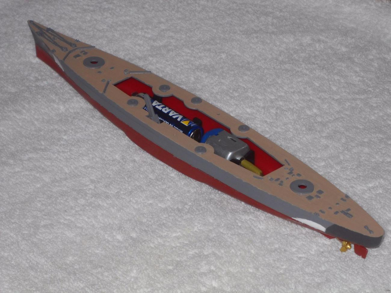 Pohonné jednotky byly převzaty ze stavebnice. V případě Bismarcka bez jakýchkoli úprav, což se později neosvědčilo. Párkrát při plavbě do lodičky zateklo skrz netěsnící hřídel a také s pákou spínače byly zaznamenány potíže v podobě tuhého chodu a kažení vzhledu modelu. K náhradě jsem se však neodhodlal z důvodu pracnosti (bylo by třeba upravit tvar nástavby a doplnit chybějící věže středních a PL děl). Na základě těchto zkušeností jsem si dal u Akagi na těsnost hřídele pozor a namísto originálního řešení jsem raději použil běžný malý páčkový spínač. Akorát nevýhoda, že pro zapnutí/vypnutí je třeba snímat letovou palubu.