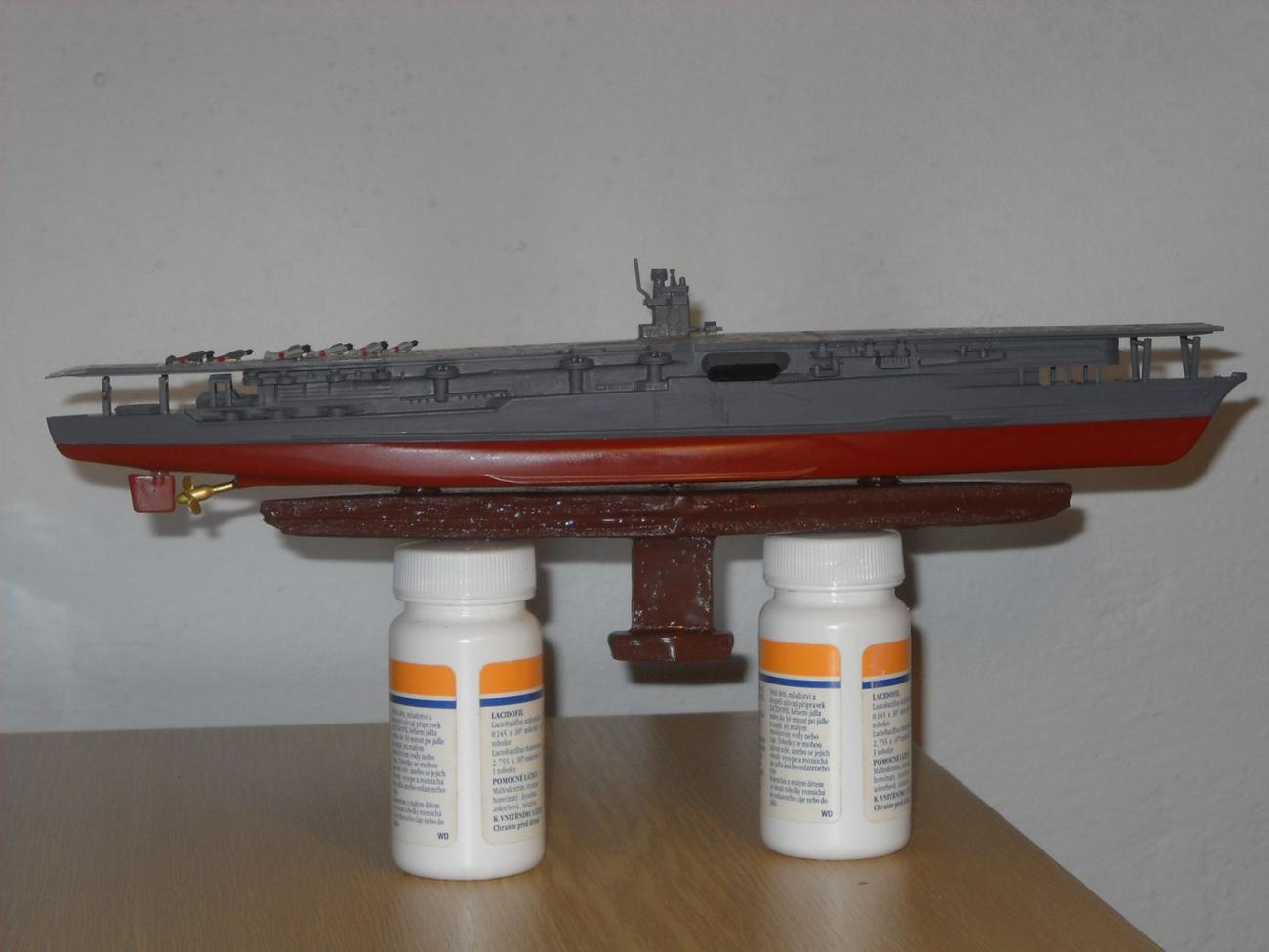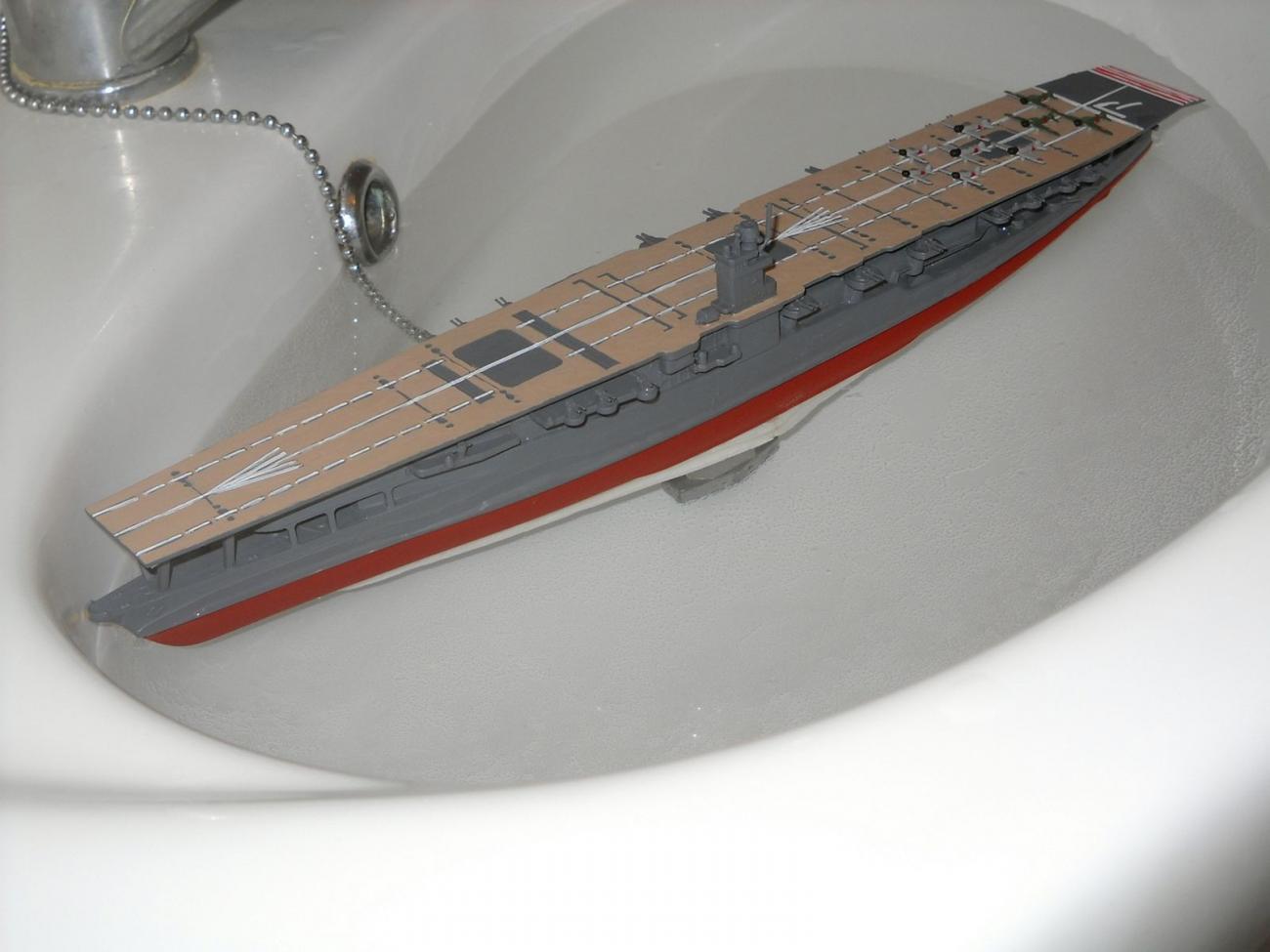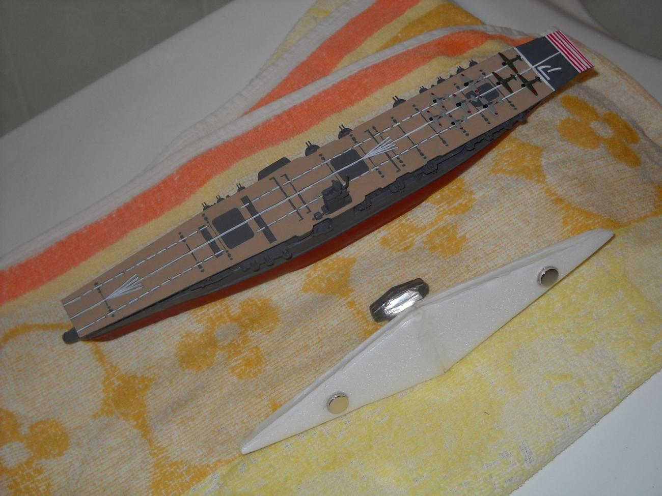 Hotový Bismarck se po spuštění na vodu v umyvadle a ve vaně choval uspokojivě. S Akagi jsem však zažil nečekaně velké komplikace. Trup byl ponořen příliš hluboko, takže loďka působila jako napůl potopená, a navíc se chovala labilně. Z kalkulací a testů vyplynulo, že nepomůže sebevětší odlehčení a jedinou šancí, jak dosáhnout, aby model působil na hladině přirozeně, bylo nějakým způsobem uměle zvýšit vztlak a stabilitu. S tou jsem se již předtím na jiném modelu potýkal a měl tedy po ruce řešení (balast na magnet pod trup). S prvně jmenovaným problémem jsem se však setkal poprvé. Nakonec jsem si poradil pomocí jednoduchého plováku z XPS přichyceného pod trup magnety. Směrem dolů z plováku vybíhá kýlová ploutev se zátěží z olůvka. Jelikož se trup při první zkušební plavbě stále nakláněl, byla posléze stabilita vylepšena prodloužením kýlové ploutve. Popsaný přípravek je možno přichytit i pod trup Bismarcka. Ten je sice stabilní dost a obejde se i bez něj, avšak jeho ponor je přeci jen o trochu vyšší, než by měl být. S pomocí plováku se čára ponoru dostane do správné pozice a model tím pádem při plavbě působí na pohled lépe.