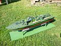 Vyřezání jednotlivých dílů jde celkem rychle, jedná se o palubu ze dvou k sobě slepených prkének balsy, kýl, dva outory a tři žebra. Při přesném řezání je kostra brzy připravená k sesazení nasucho. Tady nastaly první změny vůči plánu. Jeho autor použil k pohonu motor velikosti 500 – 600, převodovku 1:2,5, rychlostní šroub o průměru 40 mm a šestičlánek o velikosti AA. Převodovka, pouzdro hřídele šroubu a motor jsou uchyceny na dalším žebru, tentokrát překližkovém (asi 2 mm). Na nákup potřebného vybavení jsem se vypravil do prodejny Modelář Vaňouch, protože vím, že se zabývají rychlými čluny a jsou schopni poradit. Začal jsem vyjmenovávat, co všechno potřebuji a na otázku: “Do čeho to bude?“ jsem reagoval tím, že jsem vylovil z tašky plánek. “To má být rychlík?“ padla další otázka. “No, má to být dost rychlé a mělo by to vážit ke dvěma kilogramům,“ ochotně jsem potvrdil. “Tak to uděláme takhle: Dáme tam sedmistovku napřímo a desetičlánek. To by mohlo tu rychlostní čtyřicítku šroub utáhnout docela dobře. Větší šroub bych ale nedával. A v žádném případě převodovku. To je zbytečná komplikace.“ A bylo… Domů jsem si tak nesl část nákupu, desetičlánek jsem si měl vyzvednout o týden později.