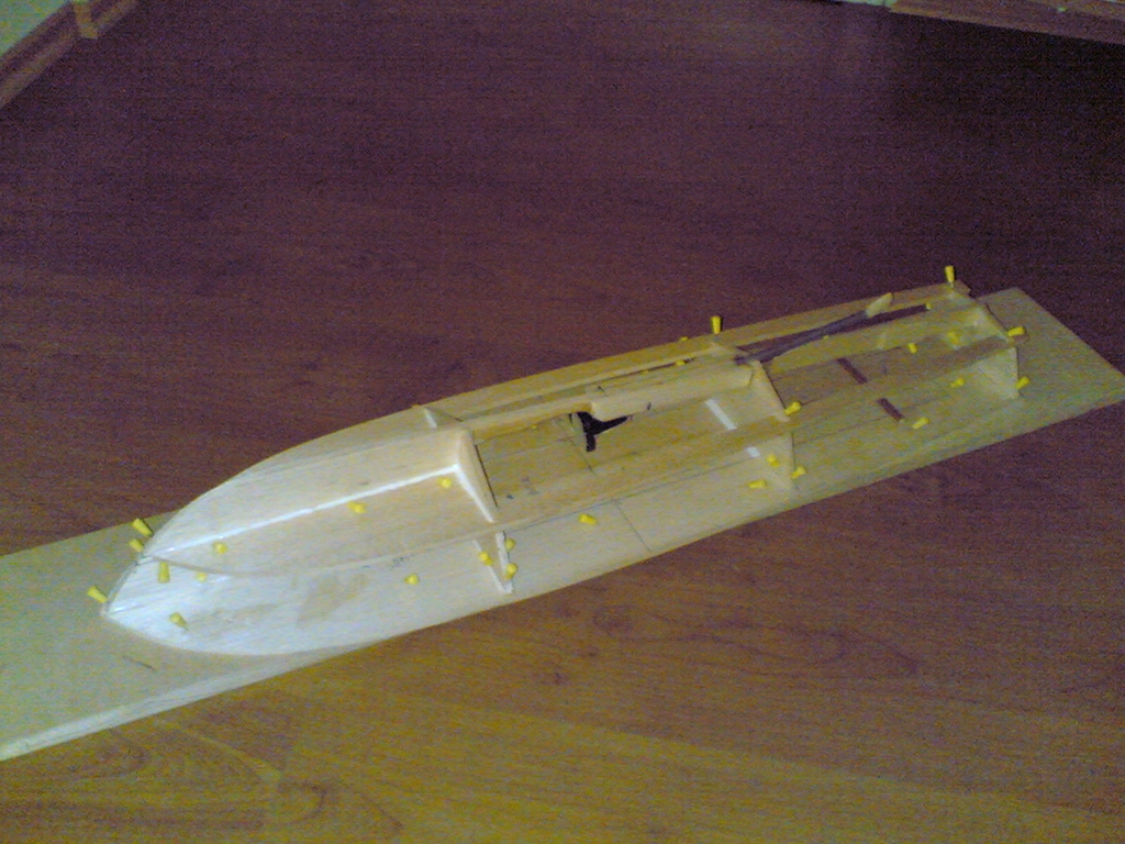 Po vytvrzení lepidla jsem přišpendlil palubu na rovnou desku a na ni postupně lepil a špendlil celou kostru (Obr. 01).
