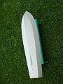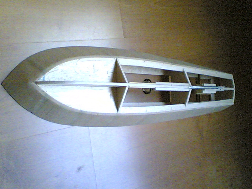 Po zaschnutí, oříznutí a zabroušení přesahů obšívky boků došlo na obšívku dna (Obr. 04). Jedinými komplikacemi byla vlepená pouzdra hřídelí a výše zmíněná nestejná kvalita použité balsy. Nově nakoupená balsa byla v pořádku, ale asi třetinu materiálu jsem měl doma a právě tahle třetina mi znesnadnila život. Dokonce i jednotlivá prkénka měla na různých místech různou tvrdost. To mi komplikovalo nejen řezání, ale tvrdší úseky se i mnohem hůře ohýbaly, což se projevilo hlavně na přídi, kde jsou dost velká zakřivení. Lepidlo, spousta špendlíků, gumových kroužků a sprostých slov ale nakonec učinily svoje a obšívka byla položená. Počkal jsem, až vše uschne, ořezal velké přesahy a zabrousil je. Konečně jsem nedržel v ruce jenom kostru, ale téměř hotový trup lodi! To jsem si tedy myslel, protože jsem ještě nevěděl, jak opatrně budu muset brousit, abych neměl trup hrbolatý. Lepené spoje šly brousit hůř kvůli vlastnostem použitého lepidla, hůře se také brousila místa tvrdé balsy, zato velice dobře ubývala balsa měkčí. Velmi důrazné poučení pro příště.