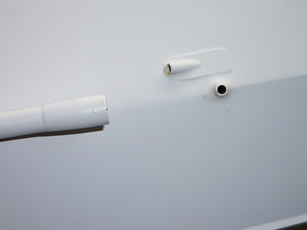 Zdířka antény je zhotovena z mosazné trubičky opatřené lemem z mosazného plechu. Do dolního konce trubičky je vlepený konektor (dutinka) s připájeným vodičem, který se jiným konektorem spojí s anténou přijímače. Ta je zkrácena navinutím na pásek PSH. Kompletní zdířka je do paluby zalepena epoxidovým lepidlem. Do otvoru v palubě se zasouvá prutová anténa: ocelová struna o průměru 0,8 mm, na jednom konci ohnutá zpět a zapájená do samečka konektoru. Na druhém konci antény je kvůli bezpečnosti zhotoveno očko. Jakmile byl trup ustrojen, přišel na řadu základní nátěr, stříkací tmel a broušení.