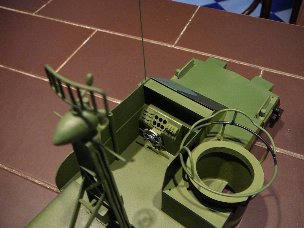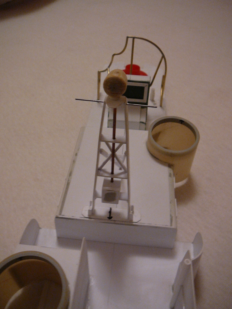 Nadešel čas dalších drobností, jako například vybavení kormidelny (Obr. 61) a dokonce jsem se rozhodl pro doplnění funkčních pozičních světel (Obr. 62, Obr. 63, Obr. 64 a Obr. 75) (omlouvám se, poslední obrázek nic moc). Ta jsem zhotovil z LED o průměru 3nbsp;mm, které jsem zalepil do trubičky PSH odvrtané tak, aby do ní šla LED těsně zasunout. Před vlepením LED jsem v trubičce vyřízl a vypiloval otvor, který by měl sloužit jako vymezovač sektoru svícení. Horní konec LED jsem zabrousil naplocho a trubičku jsem odshora zatmelil. Rozvody jsem vedl vnitřkem nástavby, jen od bílého stožárového světla jsou kablíky vedeny po stožárku. Použil jsem jednotlivé žíly servo kabelů. Napájení beru z BEC přijímače.