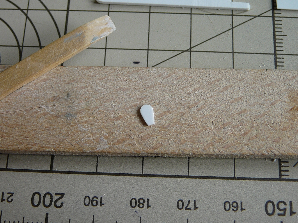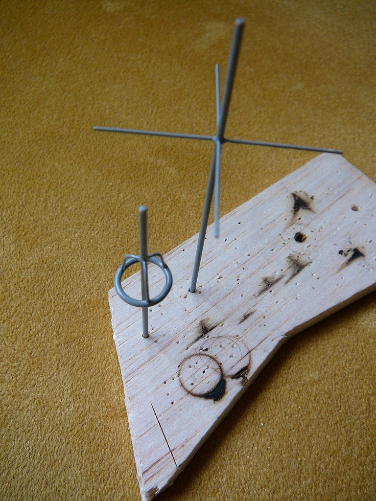Průběžně, po celou dobu stavby trupu a nástavby, jsem stavěl doplňky. Víceméně bez systému, na co byla chuť a co se dalo. Většinou výzbroj a výstroj nástavby a paluby, podle času. Tyto drobnosti se totiž dají dělat i po malých krůčcích v kuchyni na stole, což je moje pracoviště/dílna. Nic většího tam dělat nelze, protože musím co chvíli vše balit, abych uvolnil místo pro „důležitější činnosti“. Jakékoliv špinavější činnosti musí buďto na balkon nebo na chalupu. Přišel tak na řadu stožárek a omezovací oblouk 40nbsp;mm kanónu (Obr. 21), omezovací konstrukce kulometných věží (Obr. 22), záchranné vybavení (Obr. 23), tlumiče výfuků (Obr. 24) - bohužel, makro vidí i to, co moje oko už nevnímá -, a různé antény (Obr. 25). Antény a omezovače jsou z mosazného drátu různých průměrů, zohýbané do požadovaného tvaru a spájené cínem. Tlumiče jsou vlastně dvě trubičky PSH (profily Evergreen) slepené k sobě, ovinuté páskem tenkého (0,5nbsp;mm) PSH. Po zhotovení úkosu jsou konce „zavíčkované“ kouskem PSH a víčka vybroušená do tvaru. Ostatní doplňky jsou postupně nalepené.