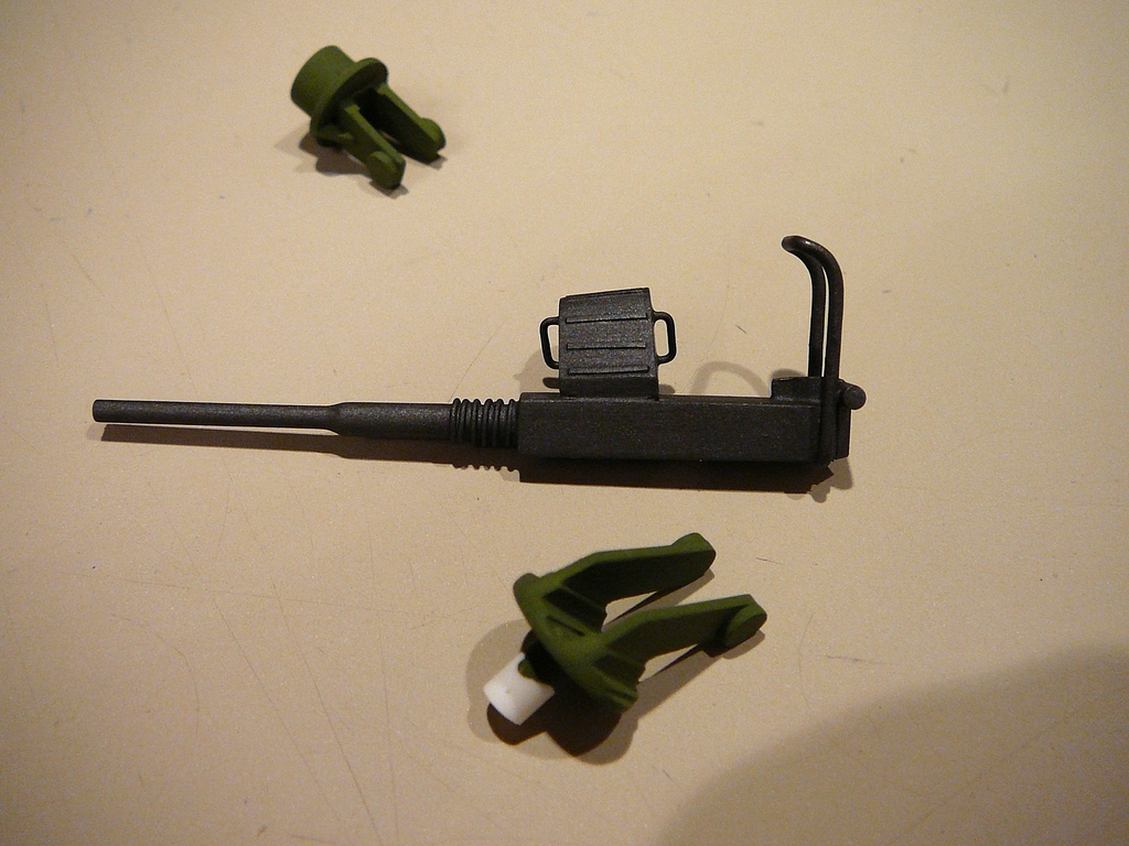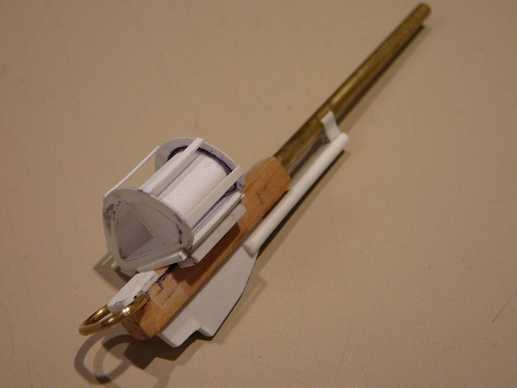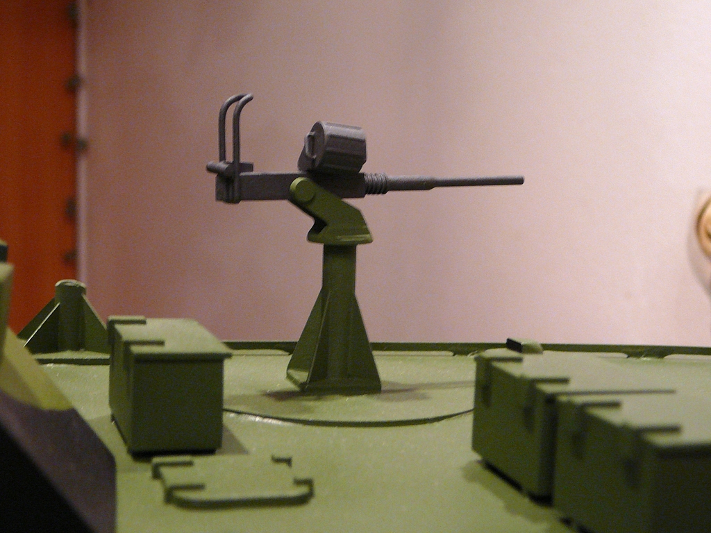 Dále přišly na řadu podstavce příďových kanónů, raketomety, bedny na munici, držáky torpéd, poklopy a ventilátory (Obr. 26 a Obr. 27). V průběhu času jsem postupně vyráběl další doplňky. Kanón 20 mm (Obr. 28, Obr. 29, Obr. 30, Obr. 31, Obr. 32 a Obr. 33), 37nbsp;mm kanón (Obr. 34, Obr. 35, Obr. 36, Obr. 37, Obr. 38, Obr. 39, Obr. 40 a Obr. 41), 40nbsp;mm Bofors (Obr. 42 anbsp;Obr. 43) z pirátských odlitků, kulomety Browning (Obr. 44) ze stavebnice AIRES a torpéda (Obr. 45, Obr. 46, Obr. 47, Obr. 48, Obr. 49, Obr. 50, Obr. 51, Obr. 52, Obr. 53, Obr. 54 a Obr. 55). Kromě stavebnic dvou zbraní je vše výroba „samo-domo“, nebo – abychom byli světoví - „scratch-build“. Materiál je tedy různý: dřevěné lišty, mosazné trubičky, měděný drát, profily a desky PSH.