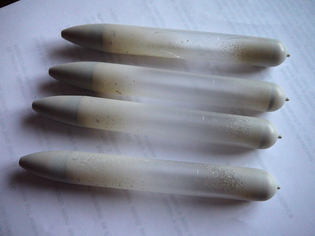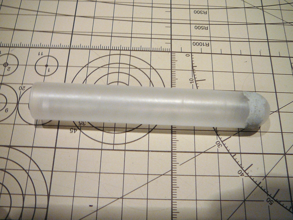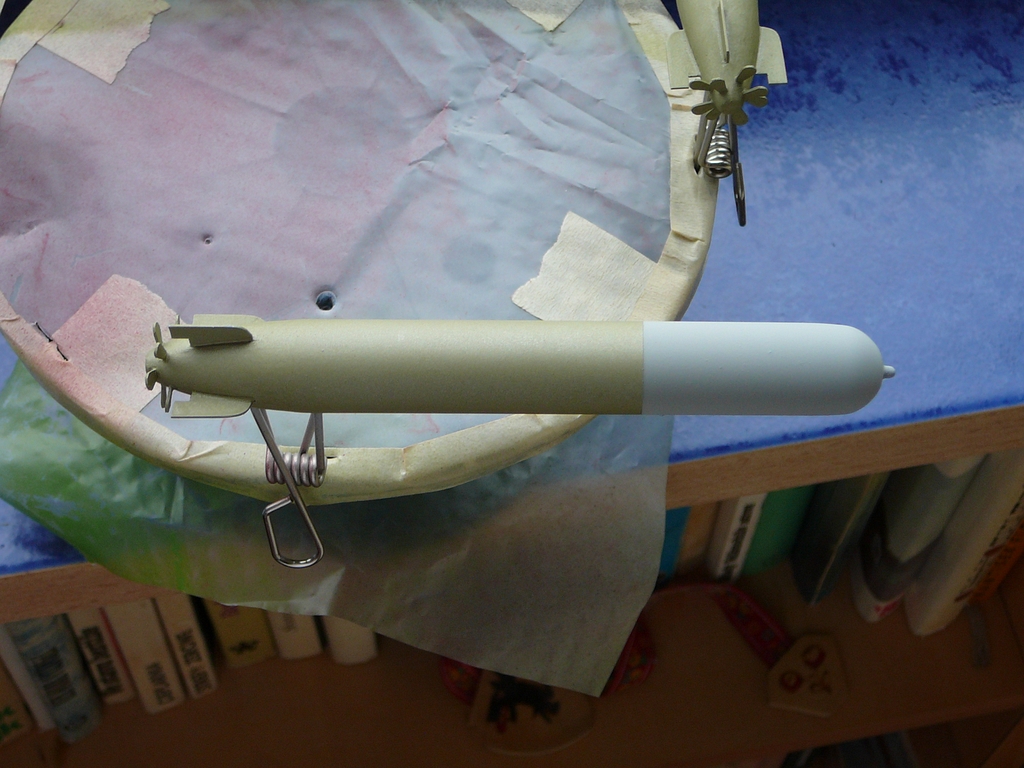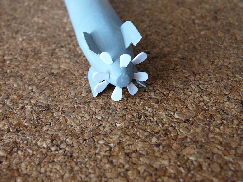 Za samostatnou zmínku stojí asi torpéda. Moji kluci totiž jednou přivlekli od kamaráda zkumavku. To by nebylo nic mimořádného, zkumavek jsem za svůj život pár viděl, ale tahle byla plastová. Po krátkém vyjednávání mi umožnili vyzkoušet „slepitelnost“. a hned napoprvé jsem se strefil: lepidlo na plastikové modely fungovalo skvěle a kousek PSH na zkumavce perfektně držel. Zabrouzdal jsem na internetu a zjistil, že zkumavky z PSH jsou běžně k dostání a navíc ve vyhovujících rozměrech (průměr 16nbsp;mm). Dokonce i délka vyhovovala mým potřebám. Při cestě k zubaři jsem proto navštívil nedalekou prodejnu s laboratorními potřebami (hned vedle prodejny PAN-AIR) a potřebné 4 kusy zakoupil. Při ceně cca 3,- Kč za kus to snad ani nešlo jinak. S koncovými kónusy torpéd už byla situace horší, protože nepatřím mezi šťastné majitele soustruhu. Nakonec vše vcelku uspokojivě vyřešil kousek balsy a upínací trn na filcové leštící kotoučky upnutý do vrtačky (Obr. 46).
