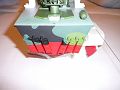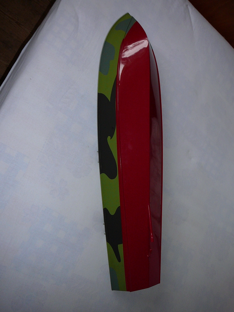 Po dokončení části zbraňových systémů jsem se rozhodl natřít nástavbu. Po důkladném zvážení, jestli zvládnu uspokojivě zamaskovat a sprejem nastříkat její relativně komplikovaný tvar, jsem došel k závěru, že radši budu „štětcovat“. Ale čím? Stříkat si barvu ze spreje do kelímku a natírat ji štětcem jsem s ohledem na vlastnosti barev radši zavrhnul. Nezbývalo, než sáhnou jinam. Dobrou osobní zkušenost mám s barvami Humbrol, které použil i autor plánku a tak bylo rozhodnuto. Sice to představovalo nutnost přestříkat celý trup znovu, ale nakonec jsem se s tím smířil. Dalším podpůrným argumentem bylo, že jsem v mezičase sehnal přesné kamuflážní schéma. Nástavbu, záď s tlumiči a všechnu výstroj jsem natřel štětcem barvami Humbrol (Obr. 56 a Obr. 57). Když byla nástavba hotová, přestříkal jsem ji při nejbližší příležitosti polomatným lakem, aby se barvy „neosahaly“. V létě na chalupě jsem celý trup nastříkal znovu (samozřejmě jsem předtím vše přebrousil), tentokrát správnými odstíny barev a ve správném kamuflážním schématu (Obr. 58, Obr. 59 a Obr. 60). Zároveň jsem zkorigoval polohu vodorysky, která mi v původním provedení trochu „ujela“. Po několikadenním schnutí jsem vše nastříkal polomatným lakem pro zlepšení odolnosti nátěru.