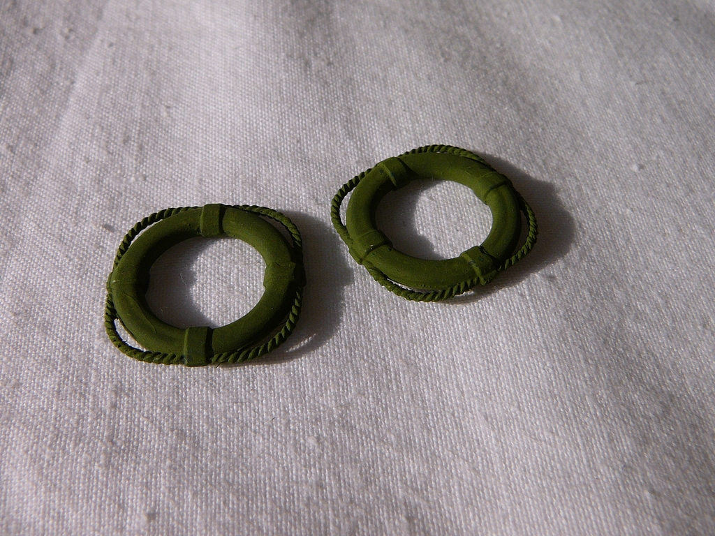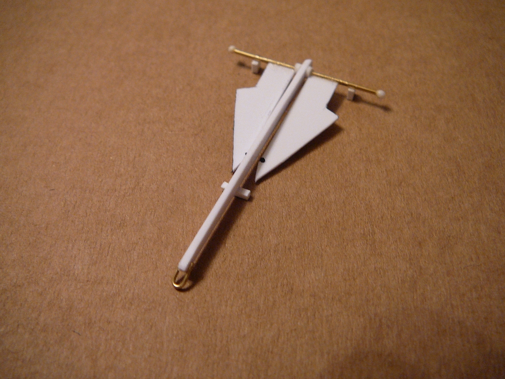 Po definitivním umístění palubních doplňků a torpéd zbývalo ještě napevno osadit příďové kanóny a raketomety. Ještě jsem se rozhodl doplnit záchranné kruhy, příďový průvlak a kotvu (Obr. 65, Obr. 66, Obr. 67 a Obr. 68).