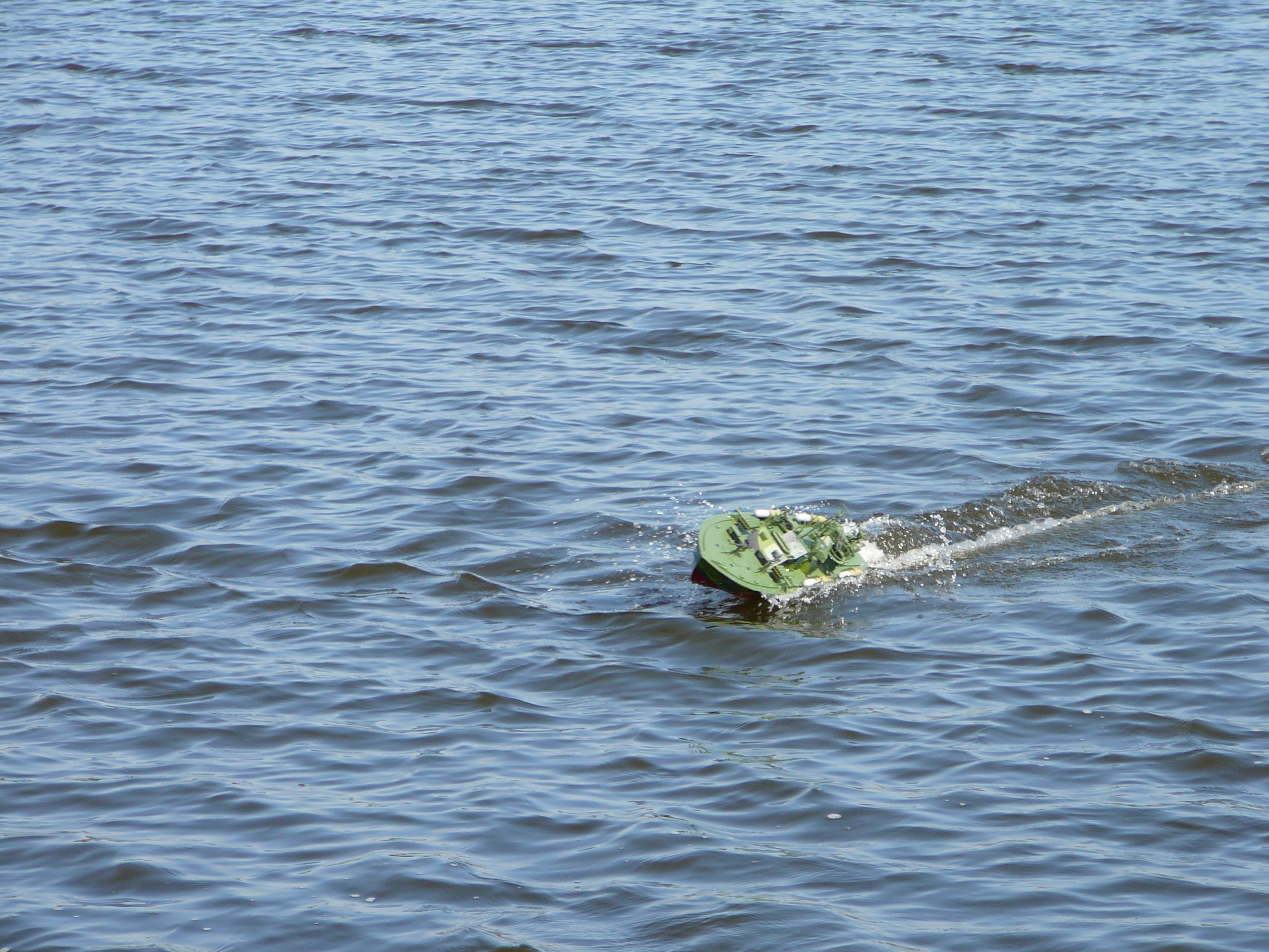 Zkušební plavba proběhla na rybníku Vejsovák v Chocenicích, kam jezdíme na chalupu. Vejsovák je docela velká vodní plocha, na kterou svého času jezdili i milovníci windsurfingu. Pro plachetnice učiněný ráj, pro motorové lodičky už to tak slavné není. Téměř neustále tam odněkud fouká (stromy jsou jen na hrázi, jinak je rybník do všech zbylých směrů otevřený), a hladina je proto často docela rozbouřená. Samozřejmě z pohledu modelového měřítka. Kvůli větru a také kvůli probíhajícímu lovu divokých kachen jsme se na panenskou jízdu nevypravili v sobotu, kdy panovalo nádherné slunečné počasí, ale až v neděli ráno, za ranní mlhy. Vidět bylo tak 200 až 300 m, ale světelné podmínky dokumentární činnosti příliš nepřály. Fotografie a kraťoučké video dokumentující další řádky byly pořízeny při dalších jízdách až o týden později. Nicméně, zpět k první plavbě.